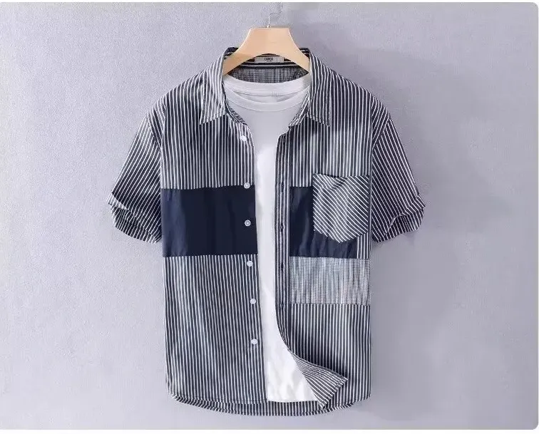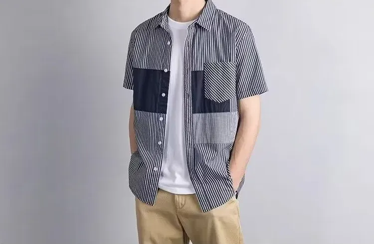 拼接撞色翻領條紋休閒時尚簡約港風襯衫