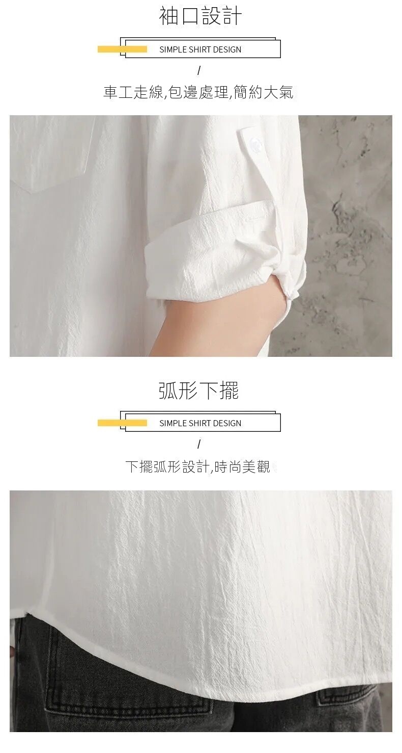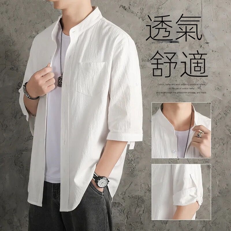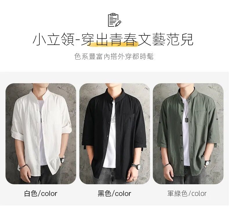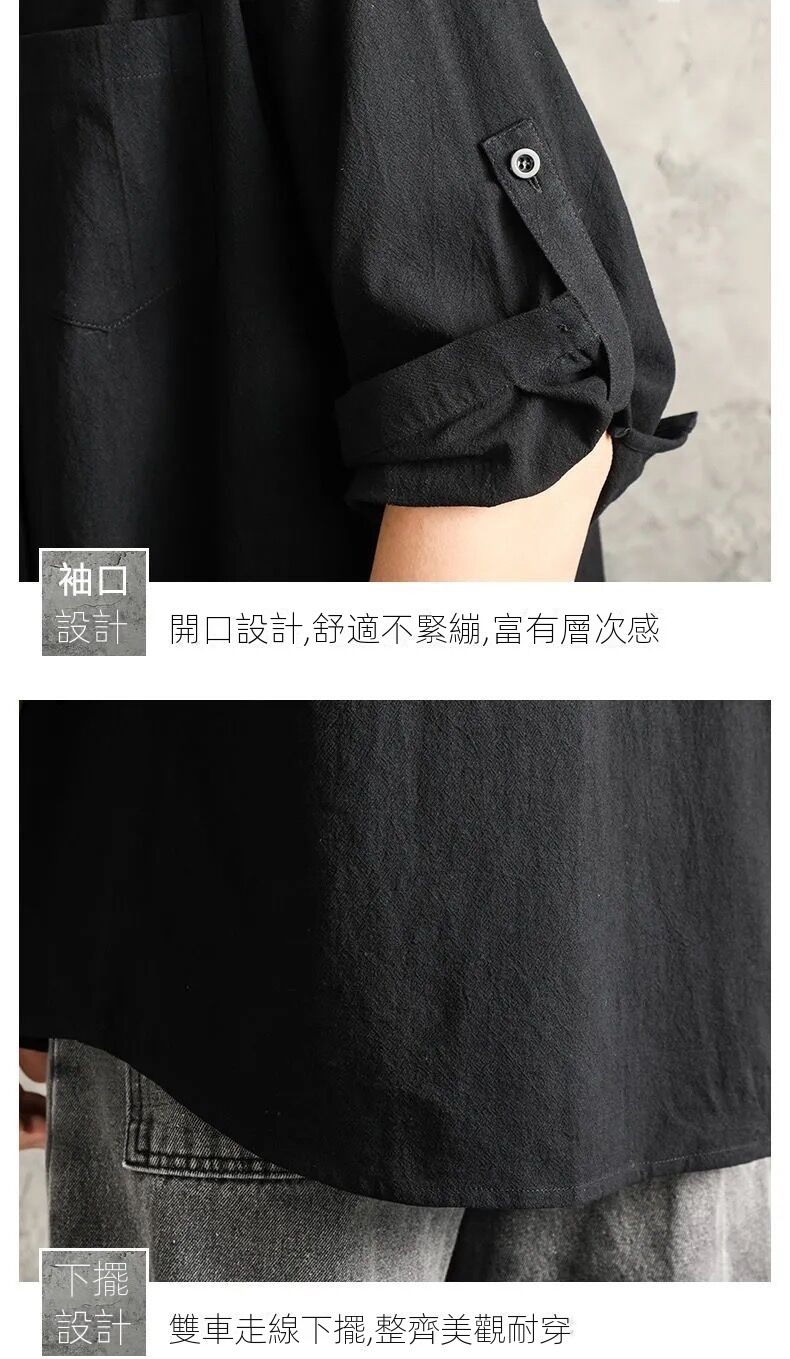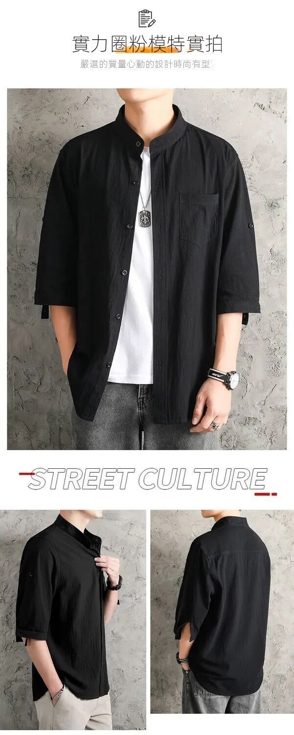 亞麻純色寬鬆國風棉麻休閒七分袖襯衫