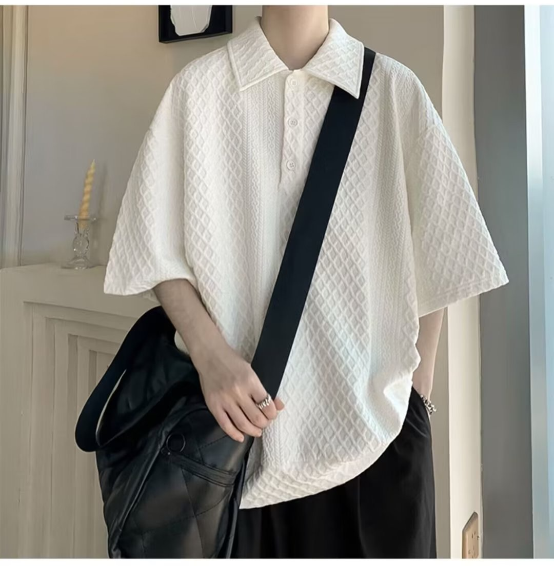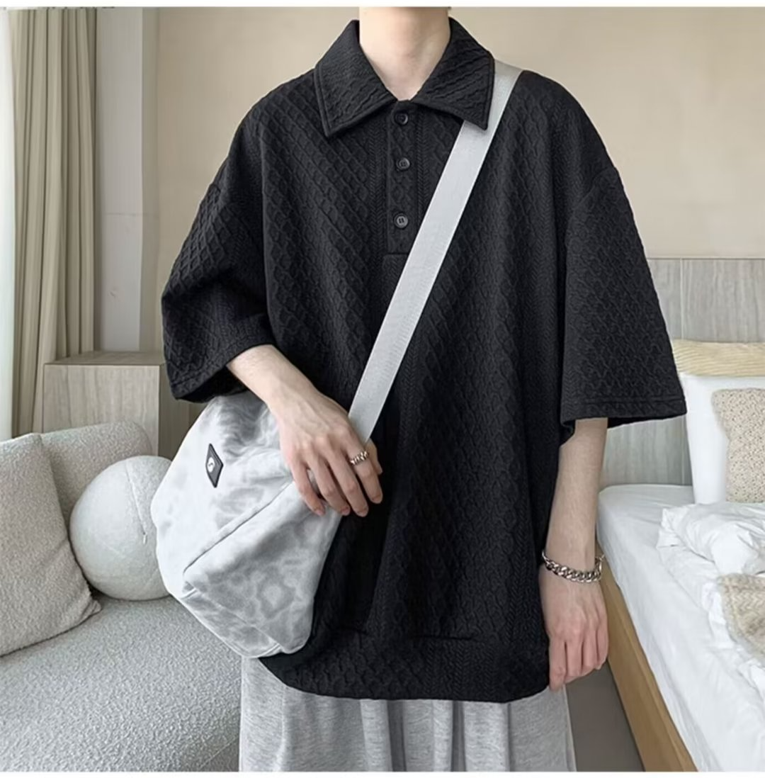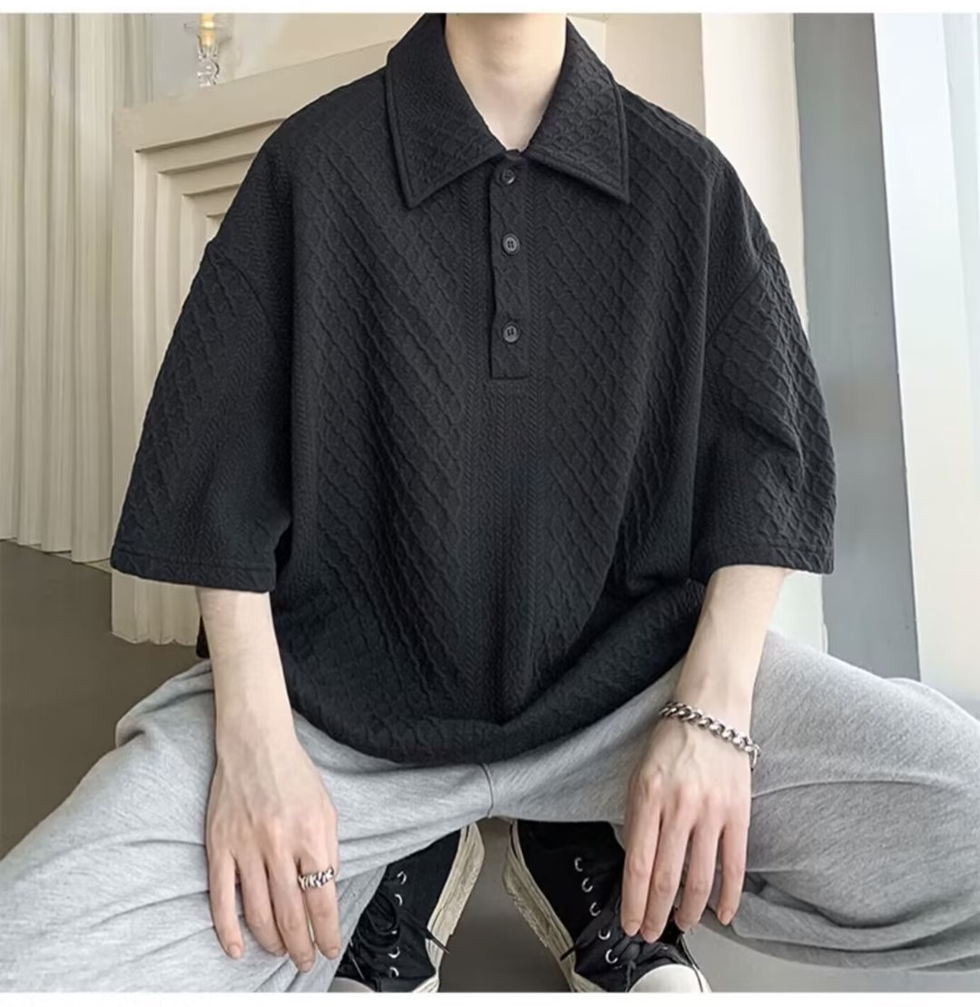 短袖polo衫男夏季潮牌宽松翻领t恤日系高级感华夫格轻熟风上衣服