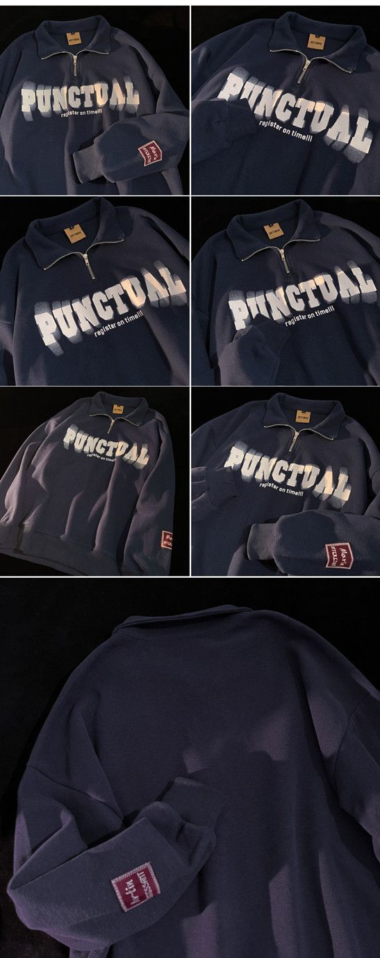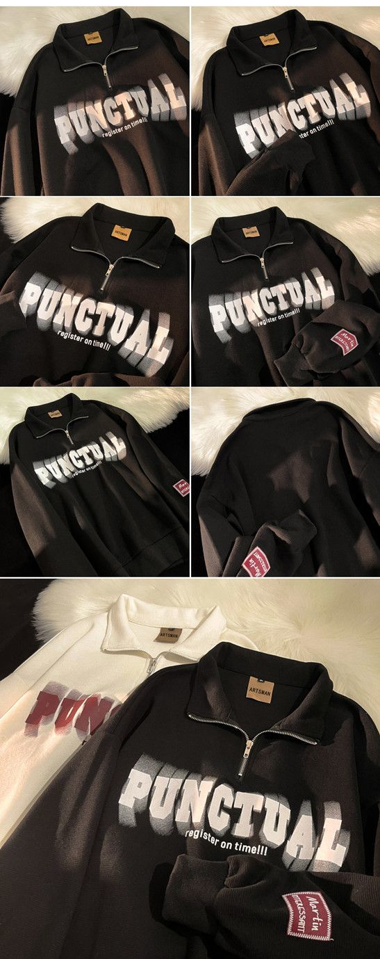 美式復古刷毛潮流半拉鍊寬鬆連帽T