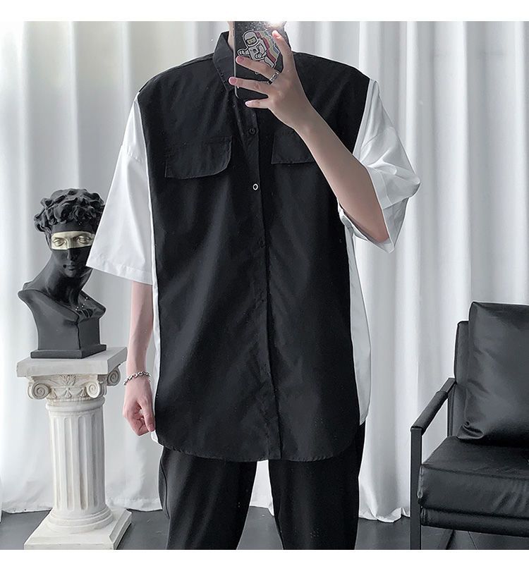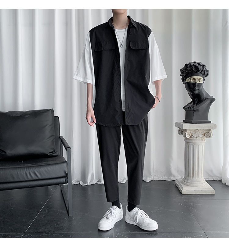 【套裝】韓版潮流帥氣撞色襯衫+內搭T恤+休閒九分褲子三件套裝