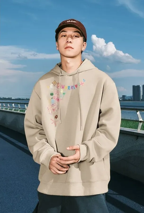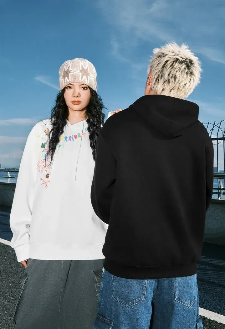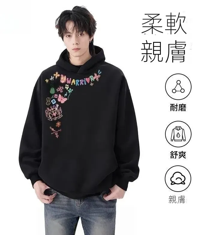 美式塗鴉花卉印花寬鬆休閒連帽情侶衛衣