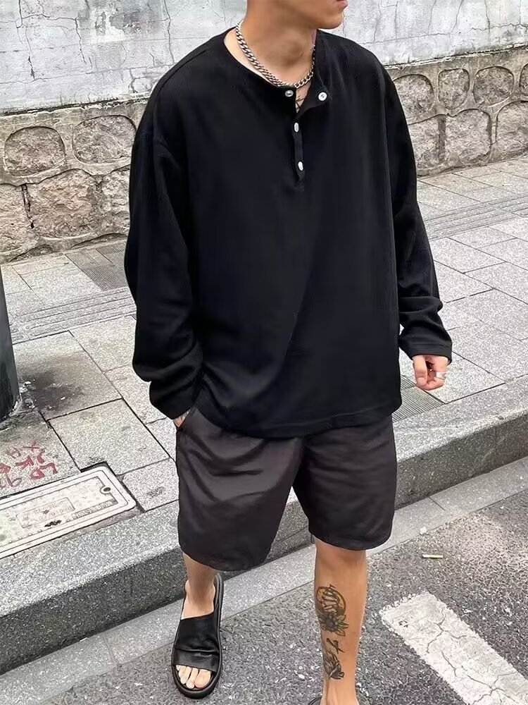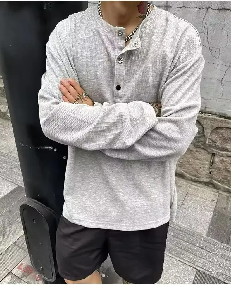 寬鬆休閒美式復古紐扣套頭長袖t恤