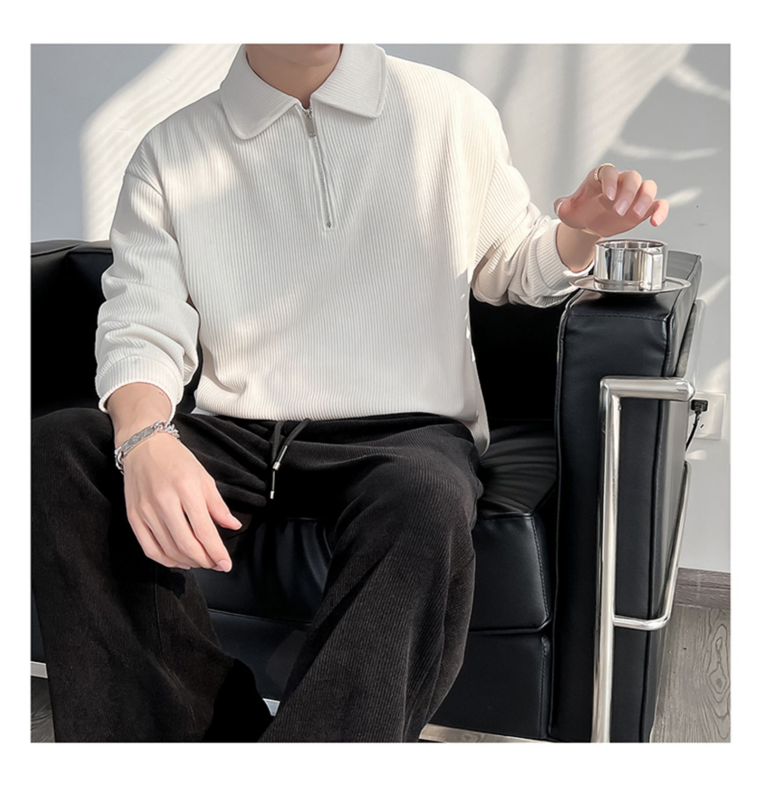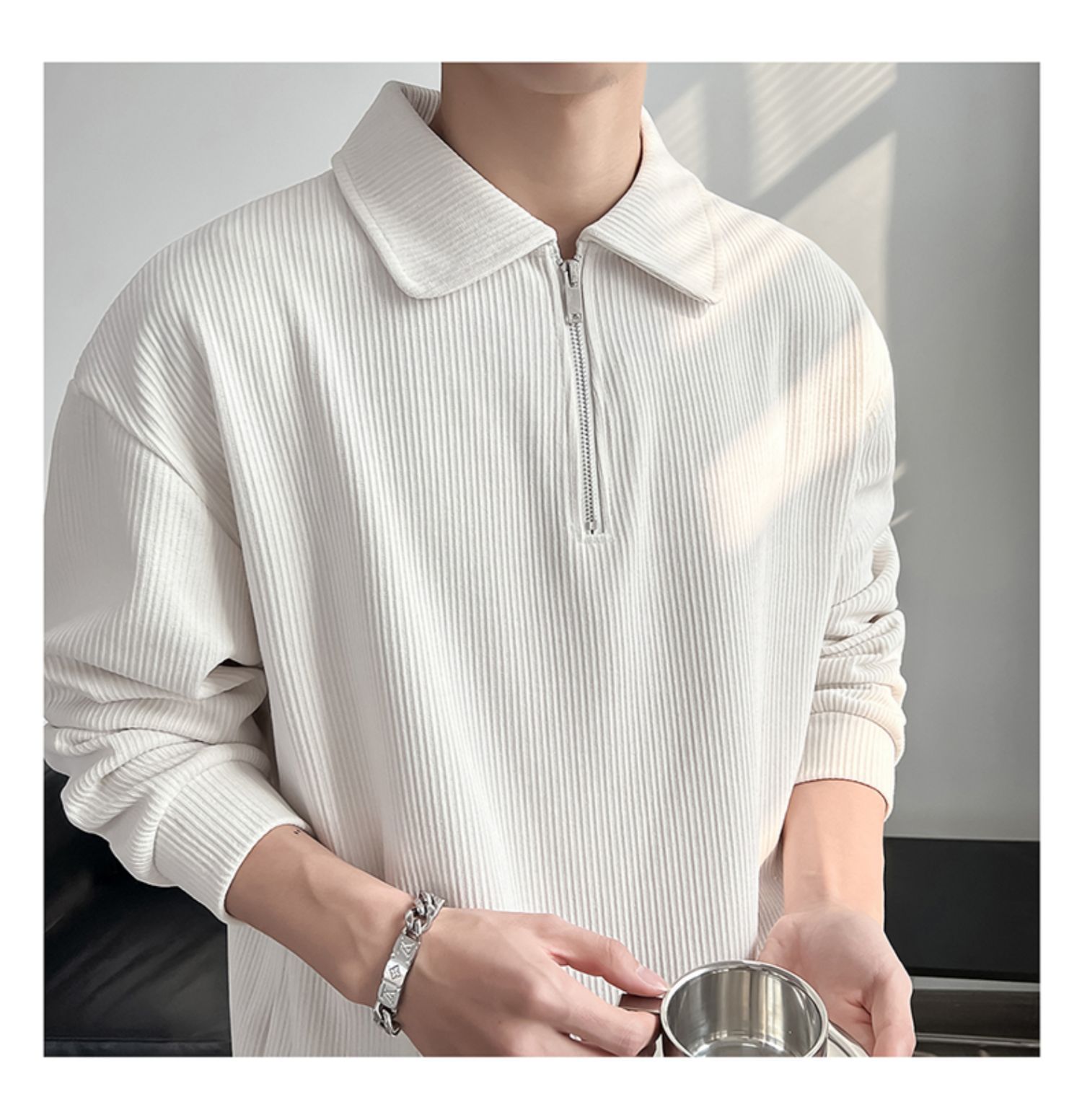 痞帥炸街輕熟風翻領條紋半拉鍊長袖polo衫