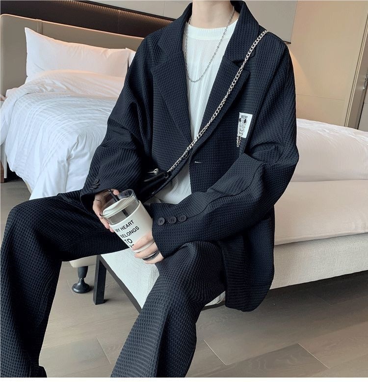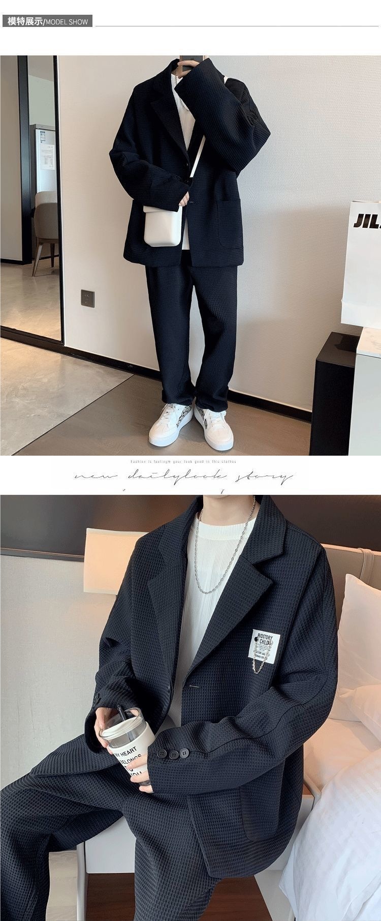 【單件/套裝】華夫格高級感西裝外套+T恤+休閑褲+項鏈四件套裝