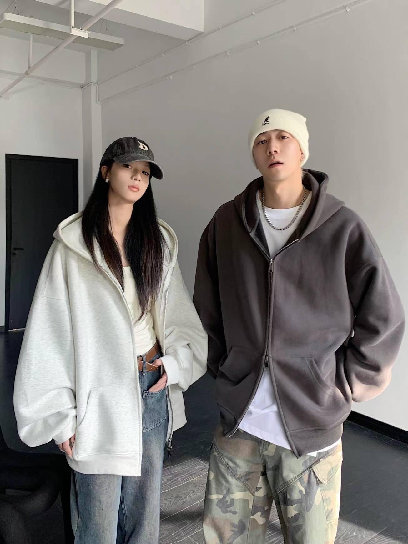 重磅時尚潮流寬鬆休閒素色開衫雙拉鏈連帽T