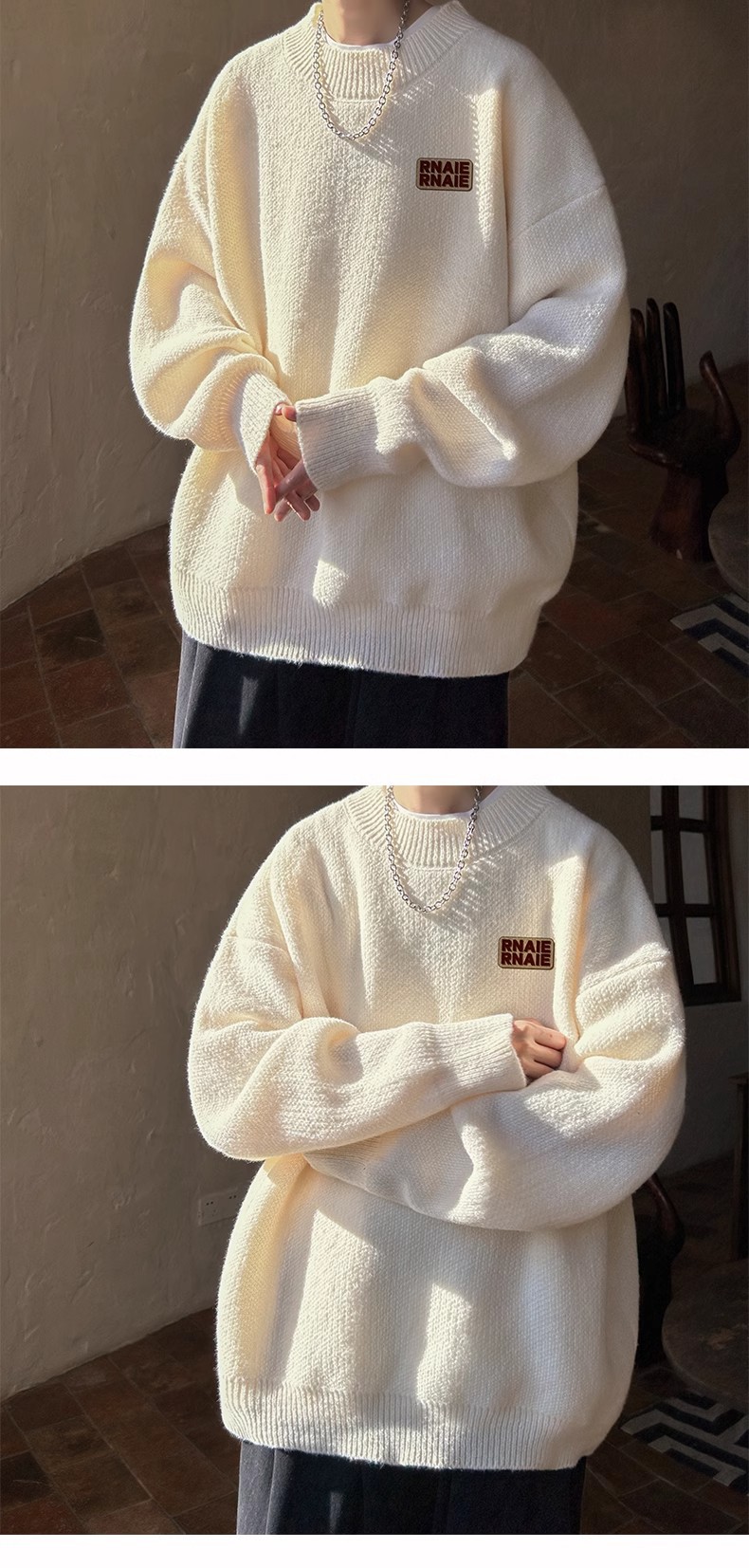 加厚慵懶風休閒寬鬆素色長袖圓領針織毛衣