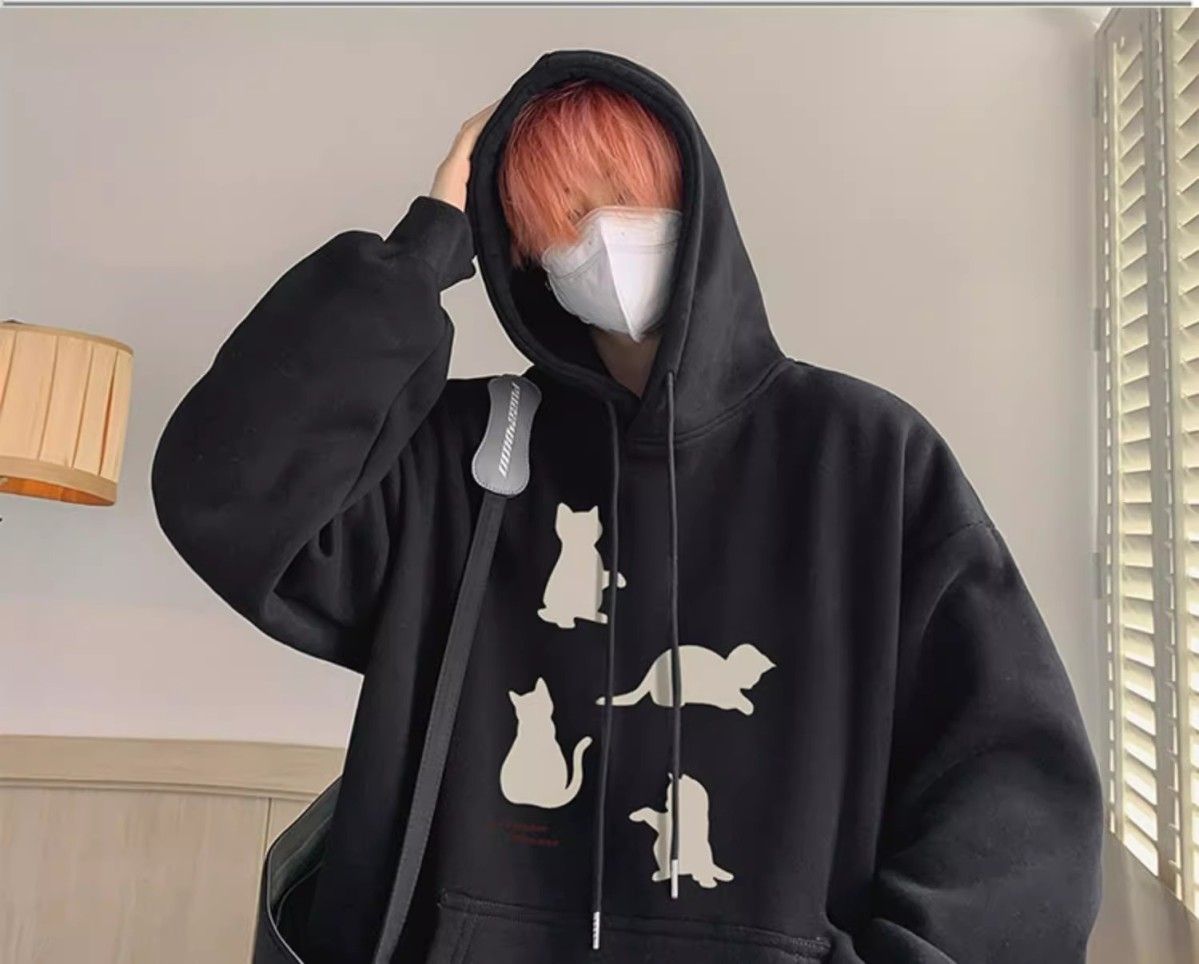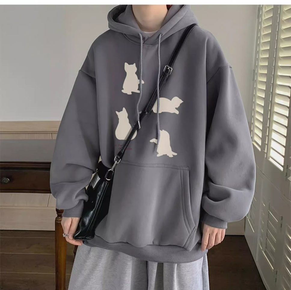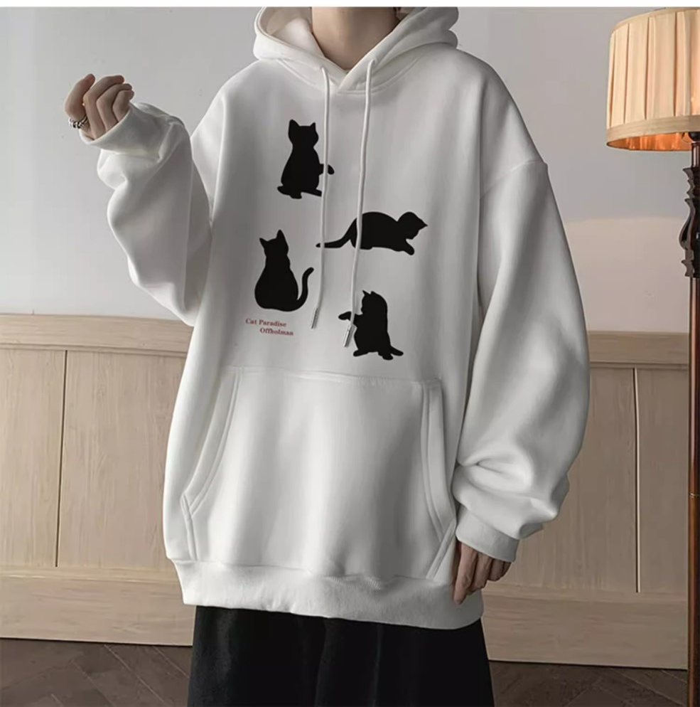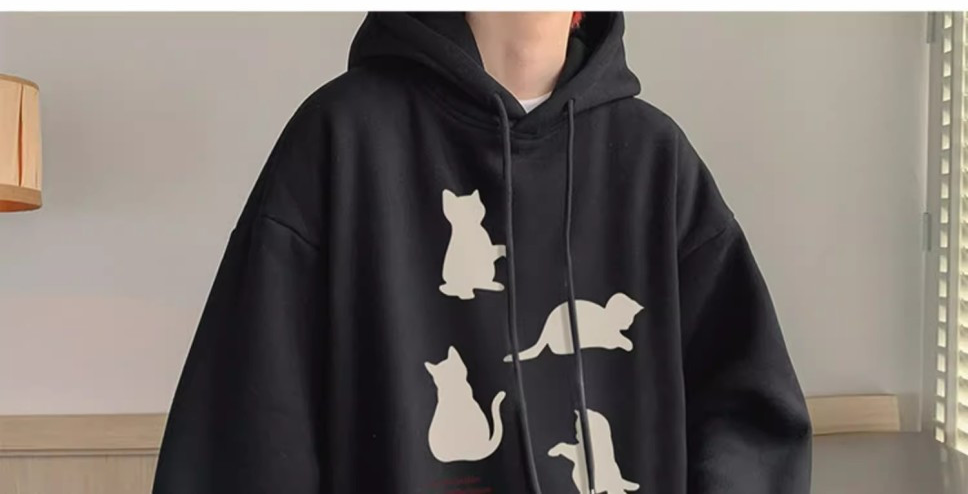 卡其色刷毛加厚小貓印花潮牌美式重磅連帽T