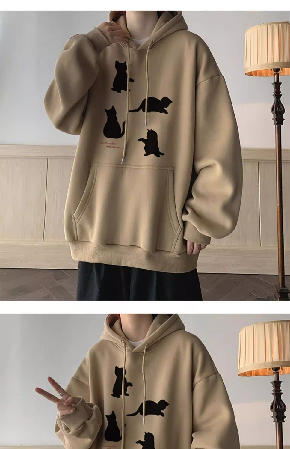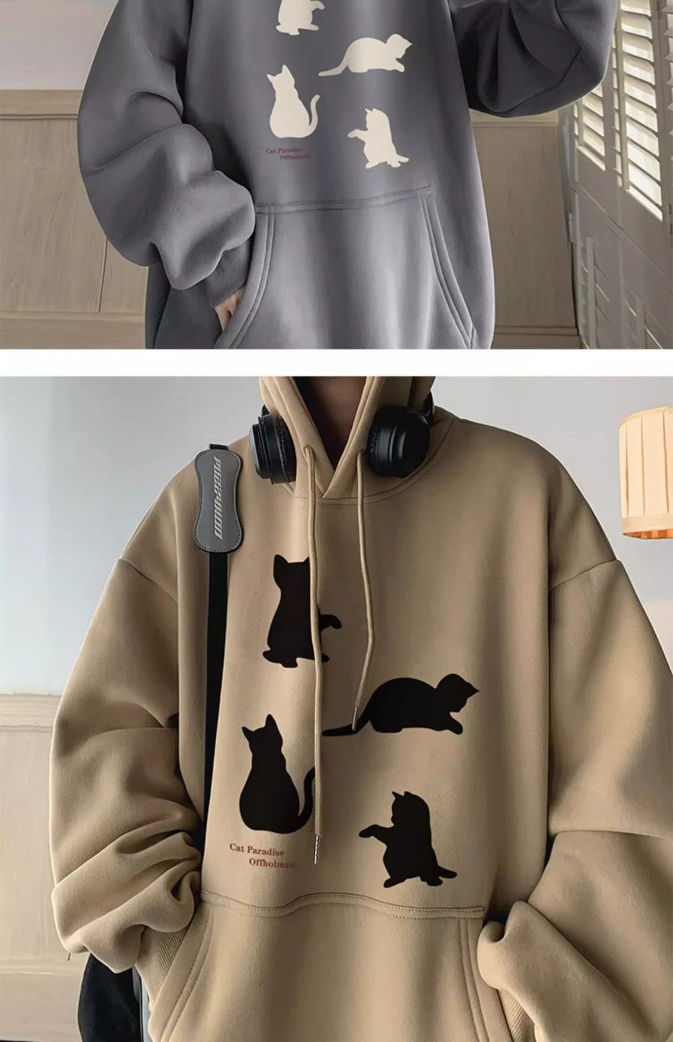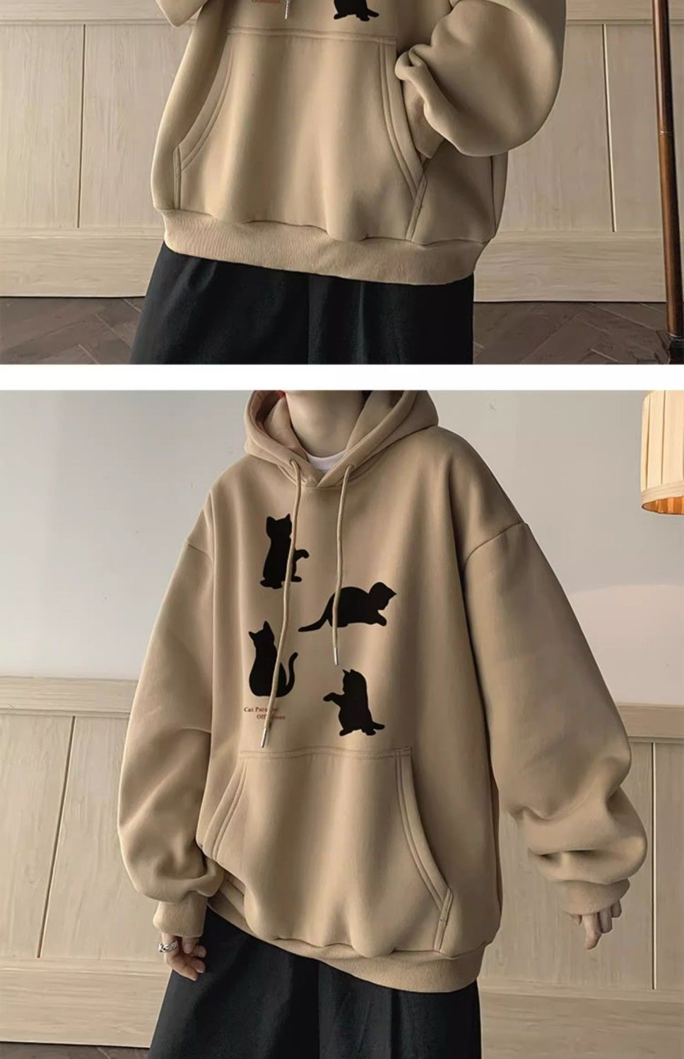 卡其色刷毛加厚小貓印花潮牌美式重磅連帽T