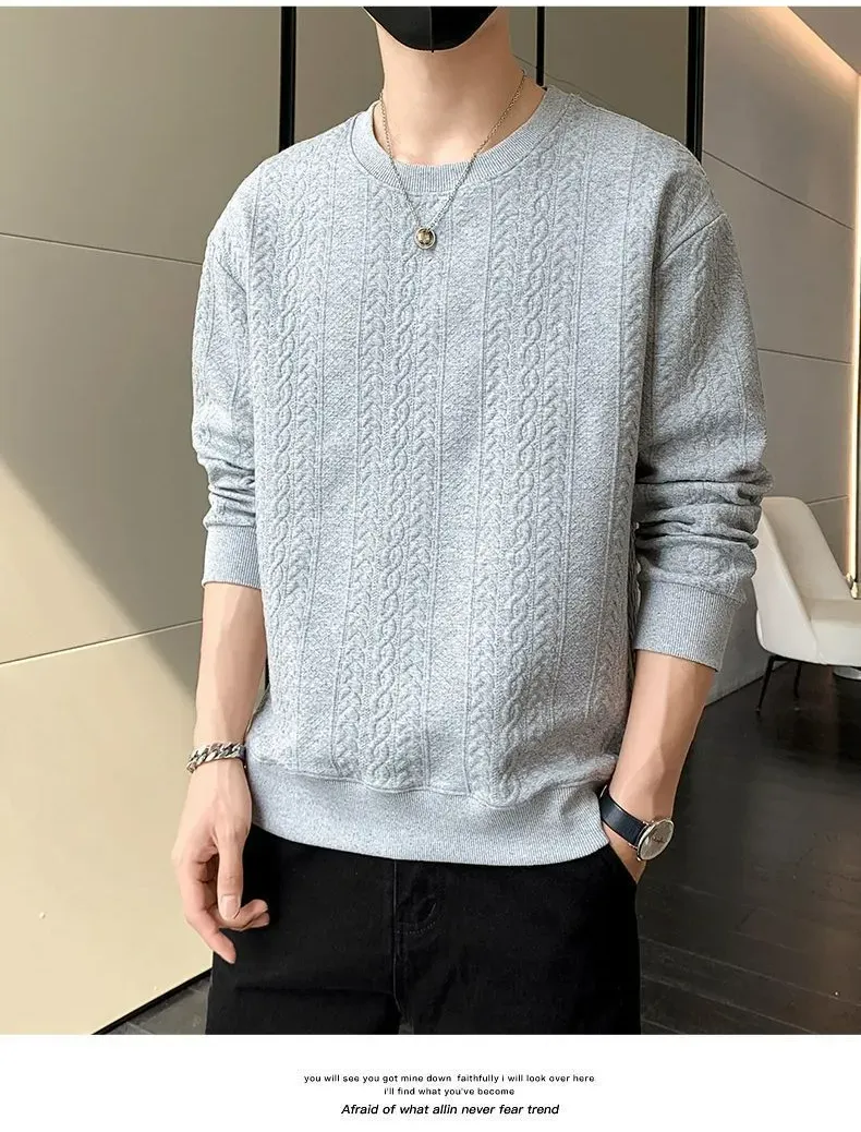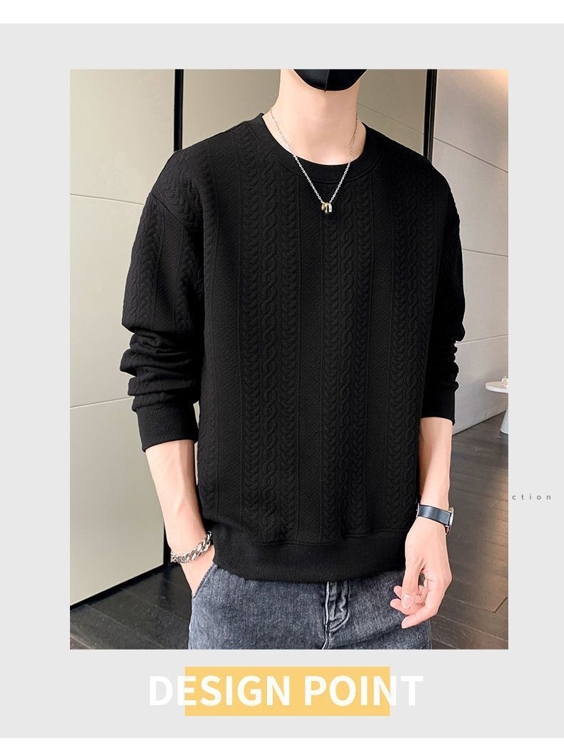 潮流純色肌理紋寬鬆圓領休閒長袖T恤