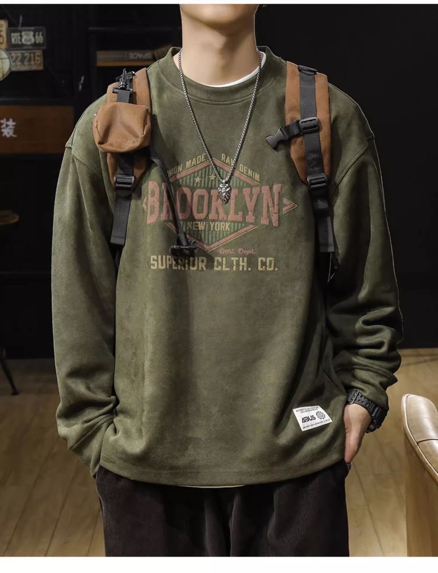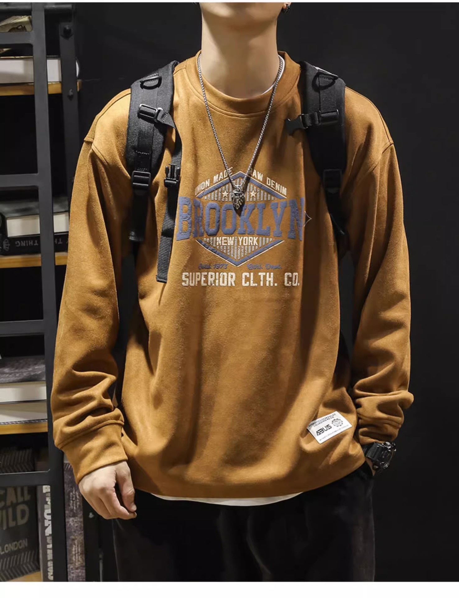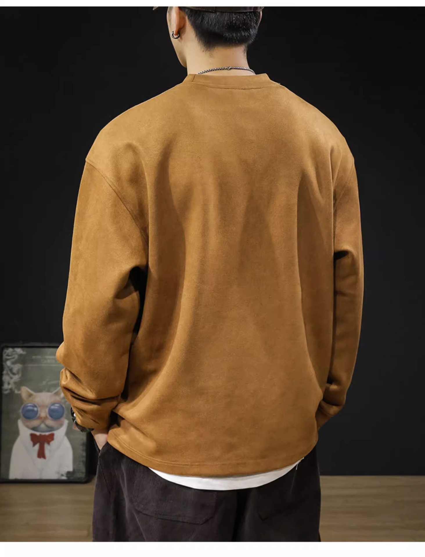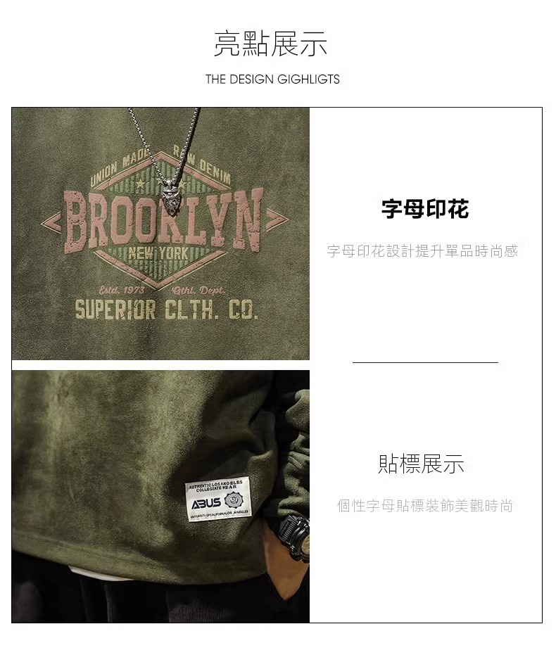 美式復古麂皮絨寬鬆潮牌圓領長袖T恤