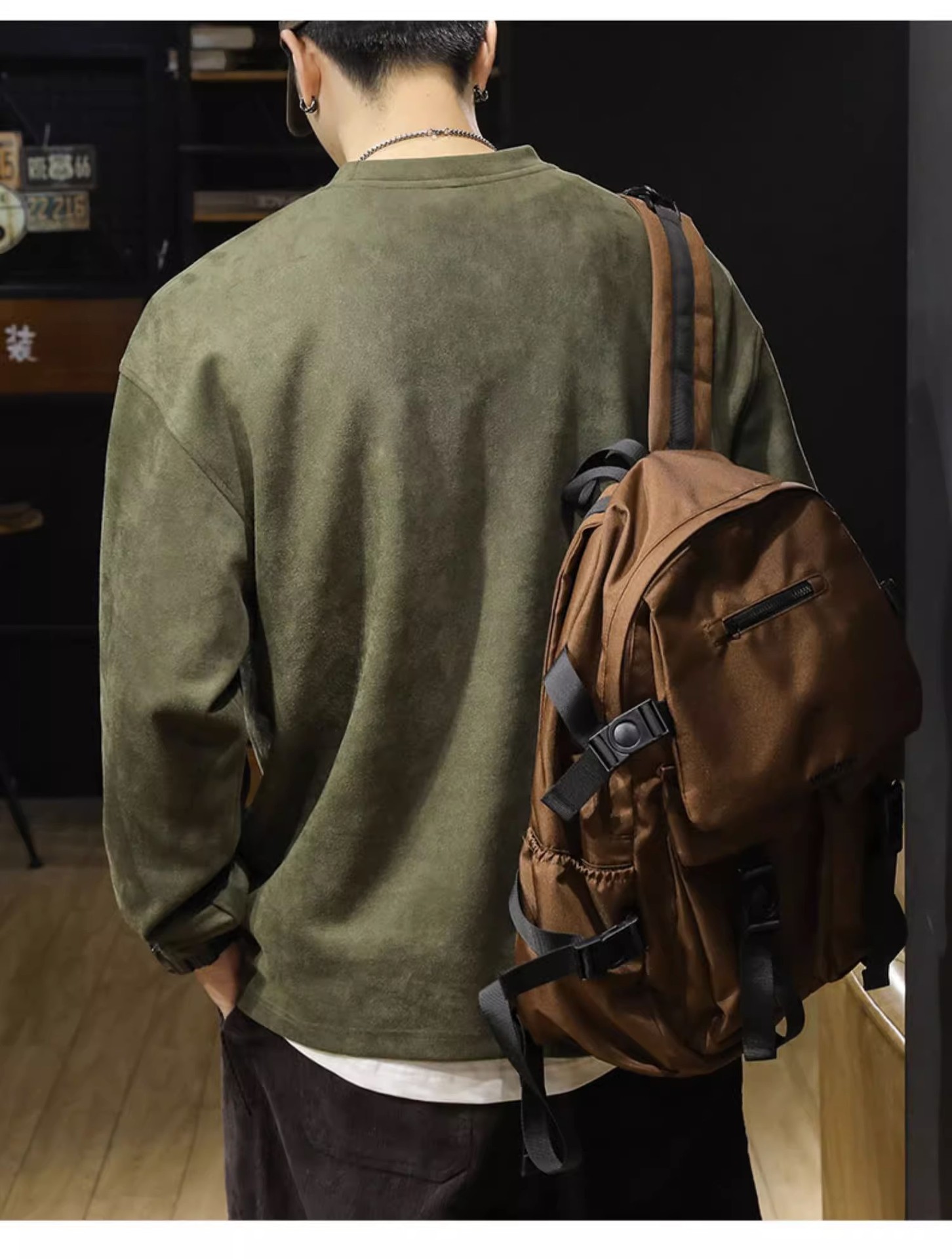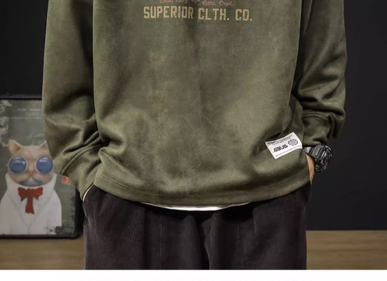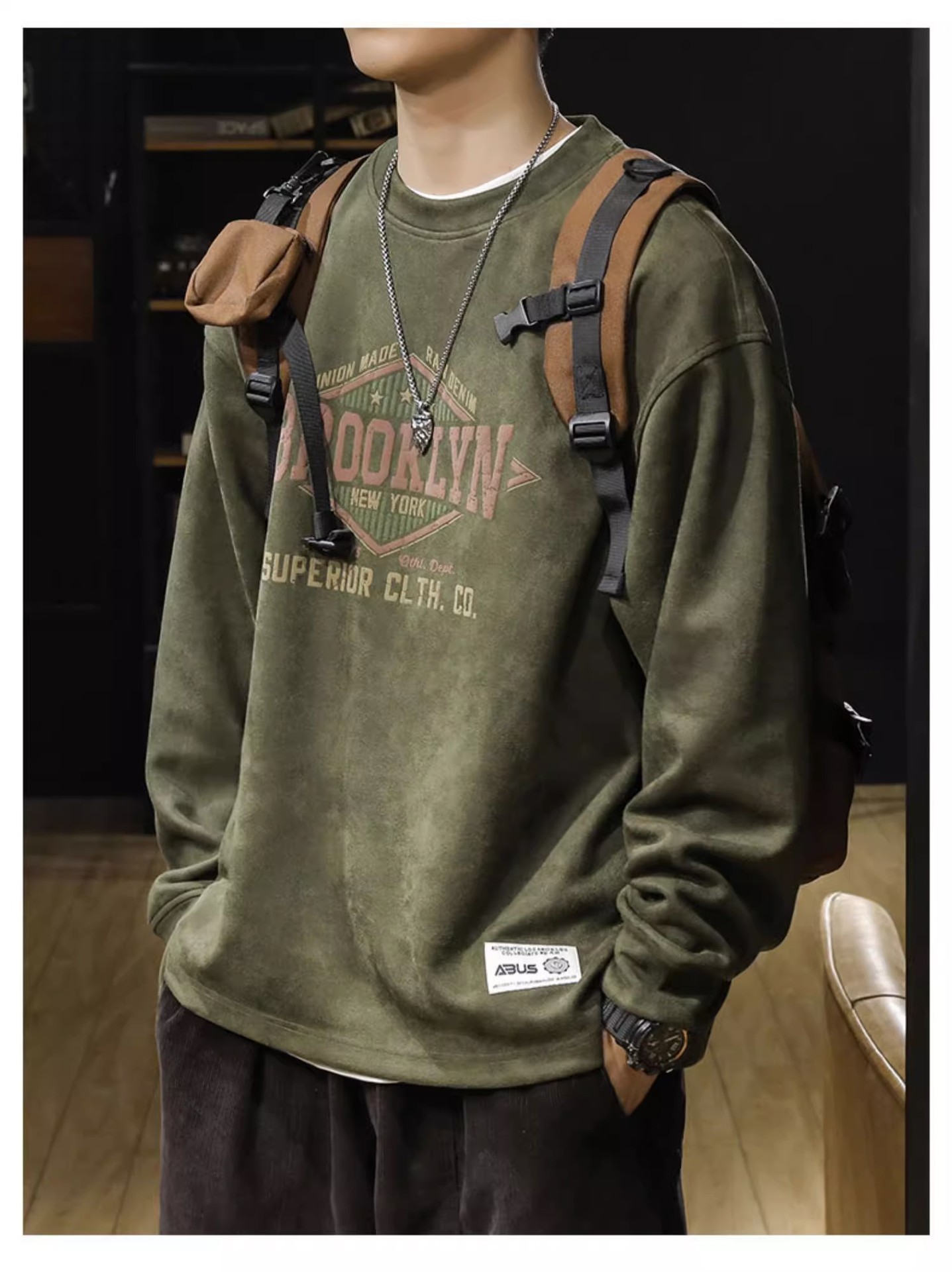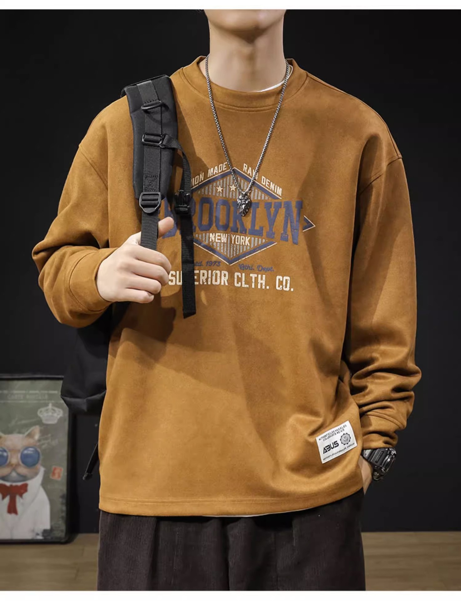 美式復古麂皮絨寬鬆潮牌圓領長袖T恤