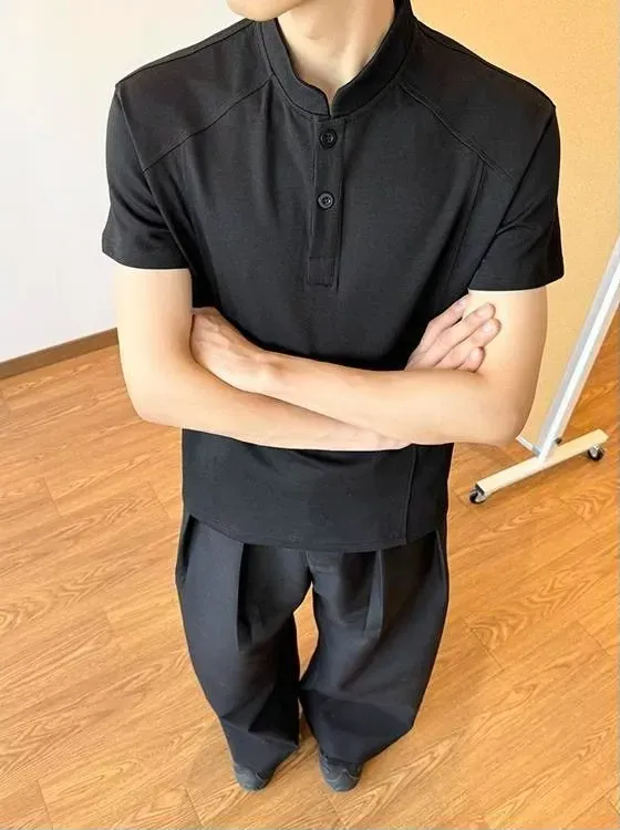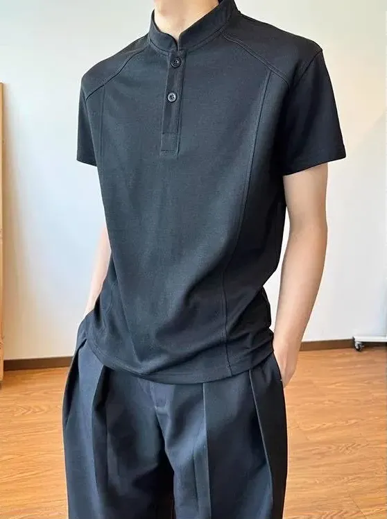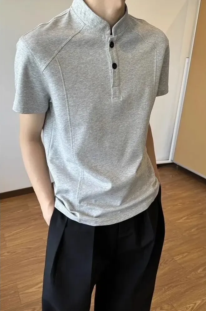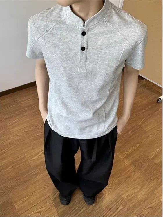 美式纽扣亨利領正肩顯瘦短袖T恤