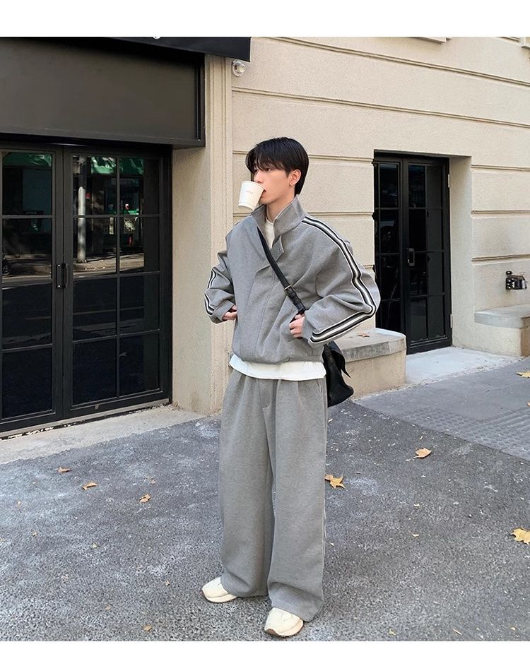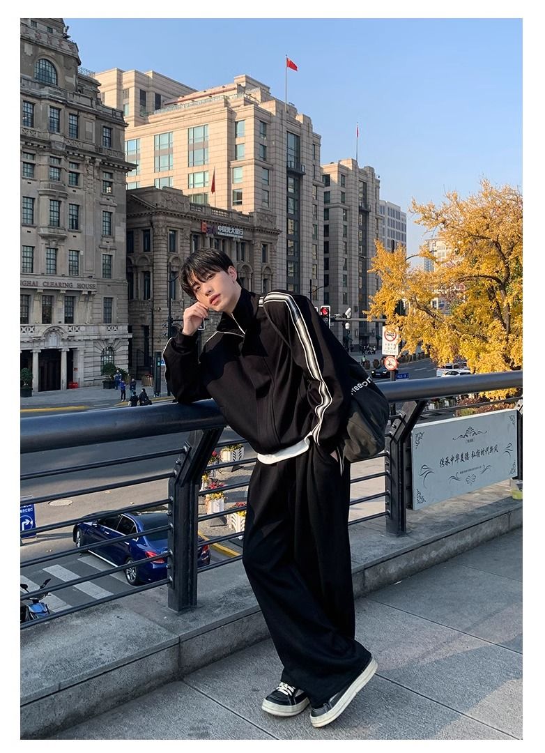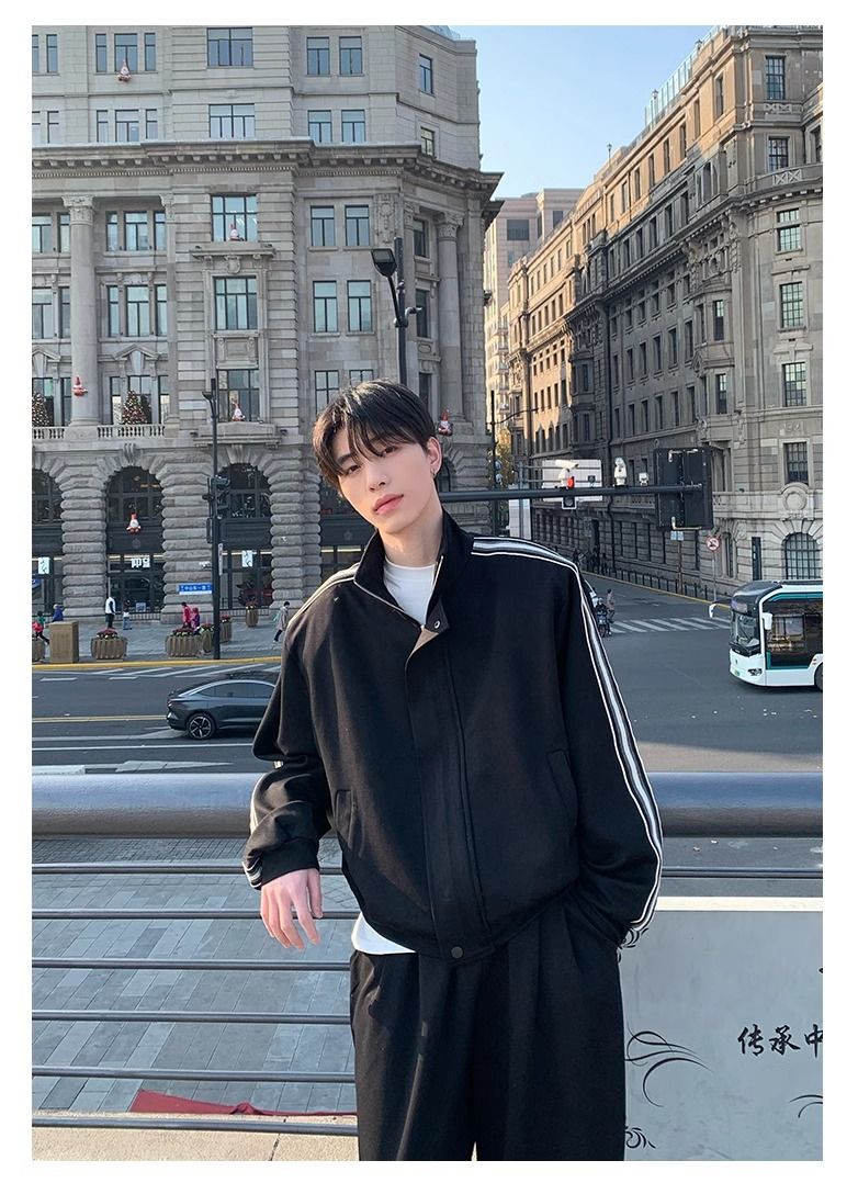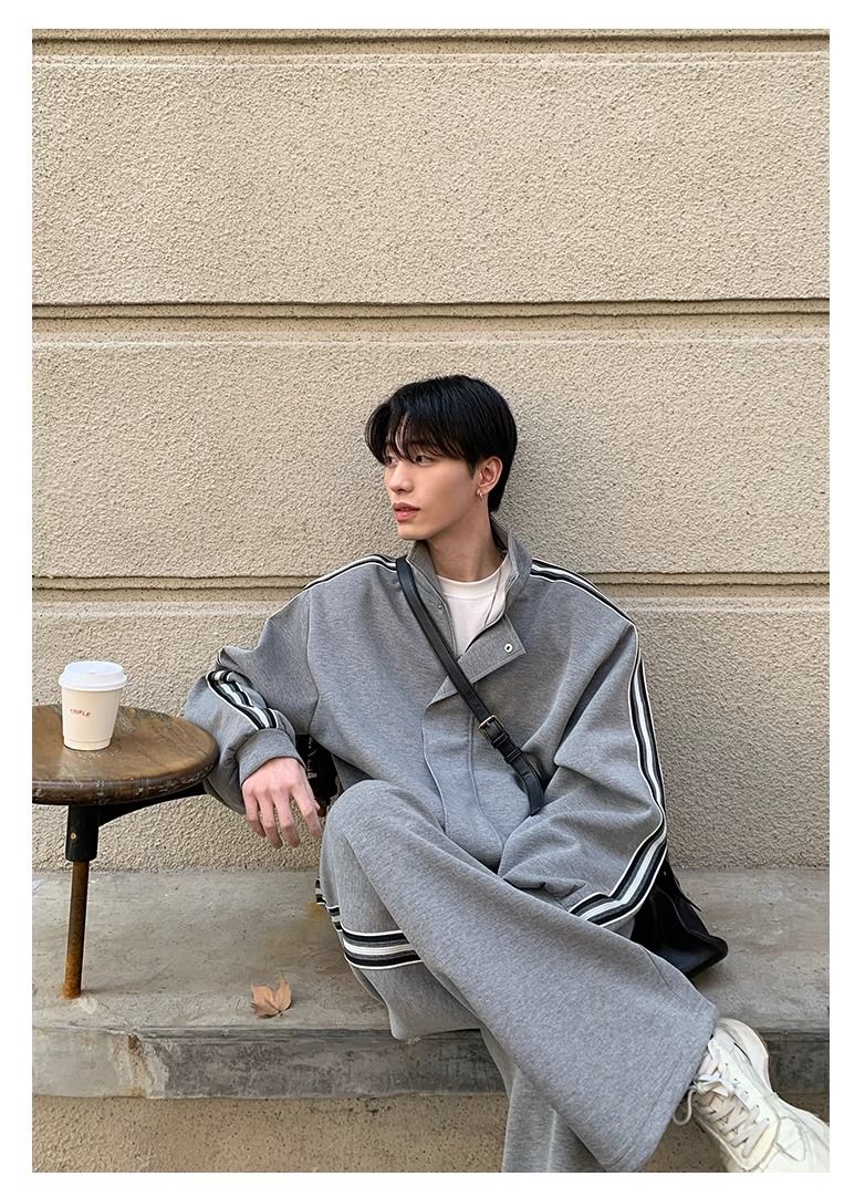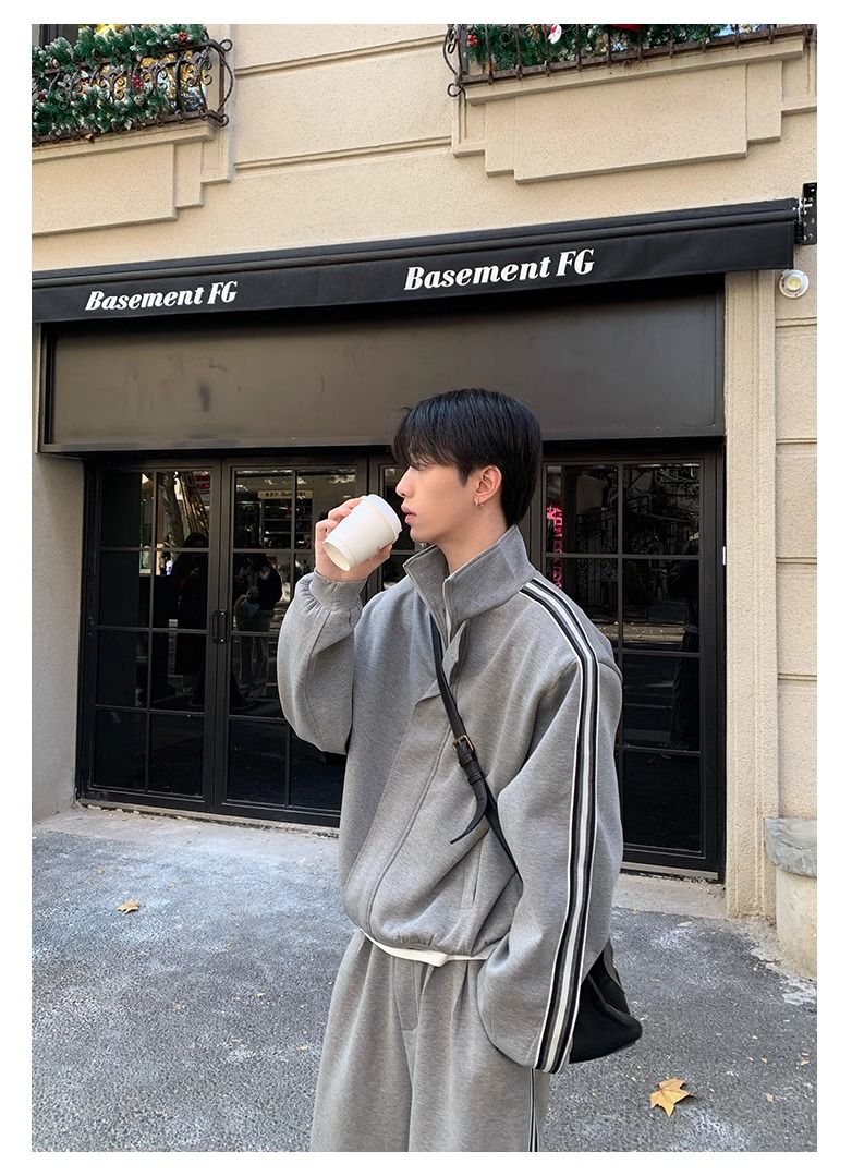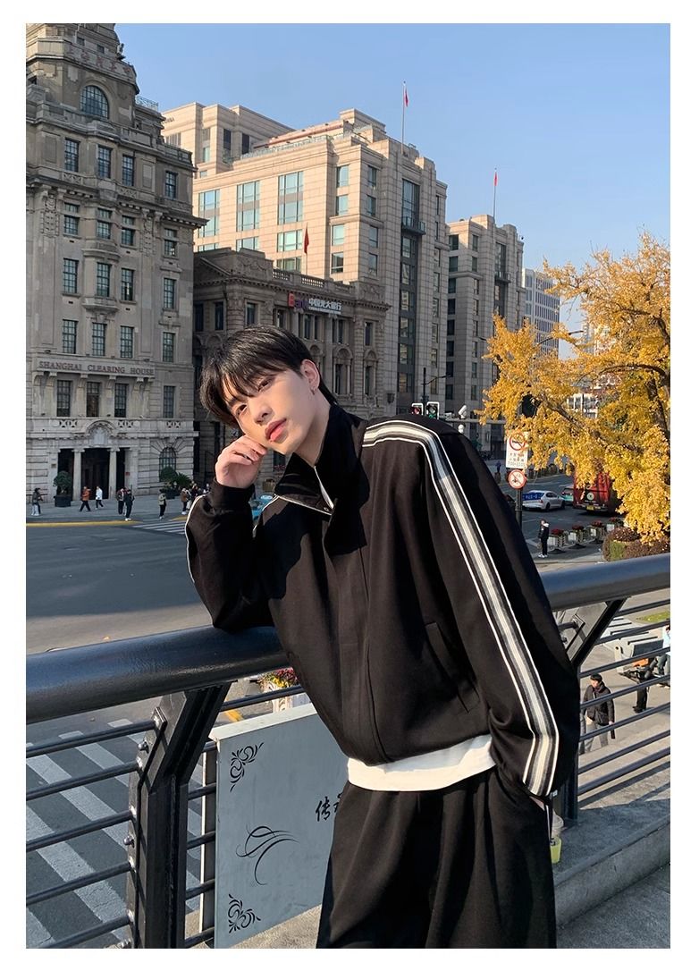 【單件】韓系立領撞色杠條休閒運動兩件套裝