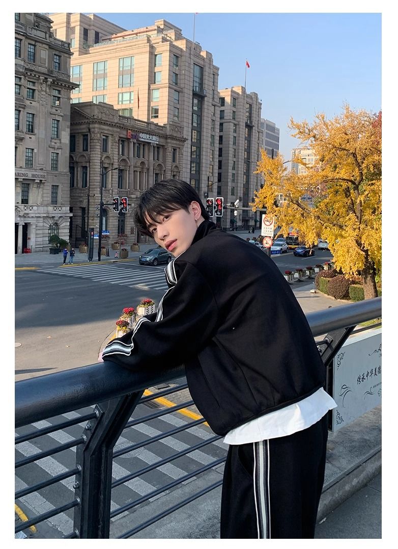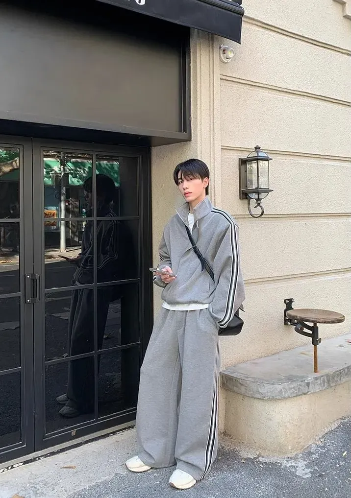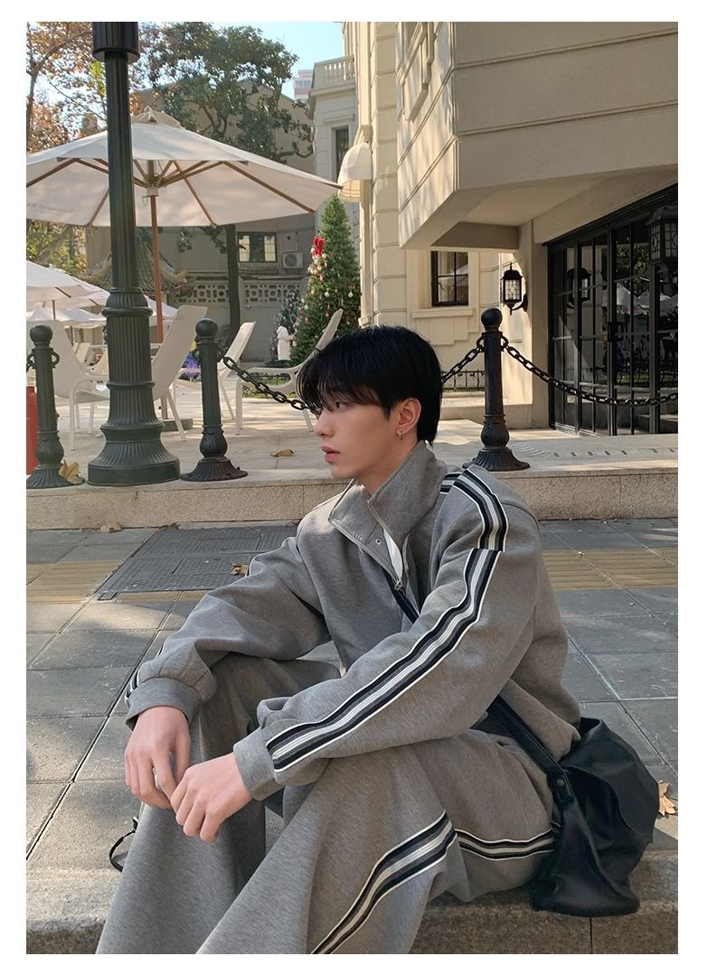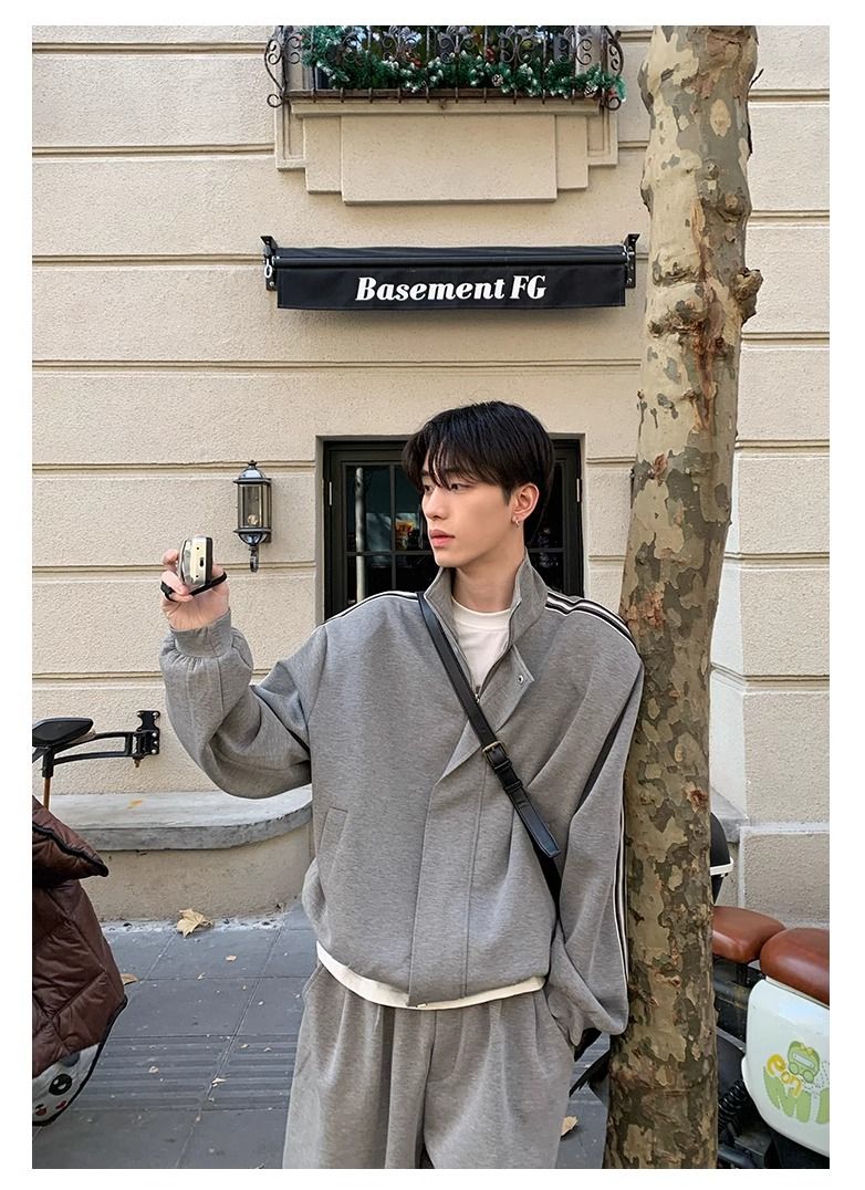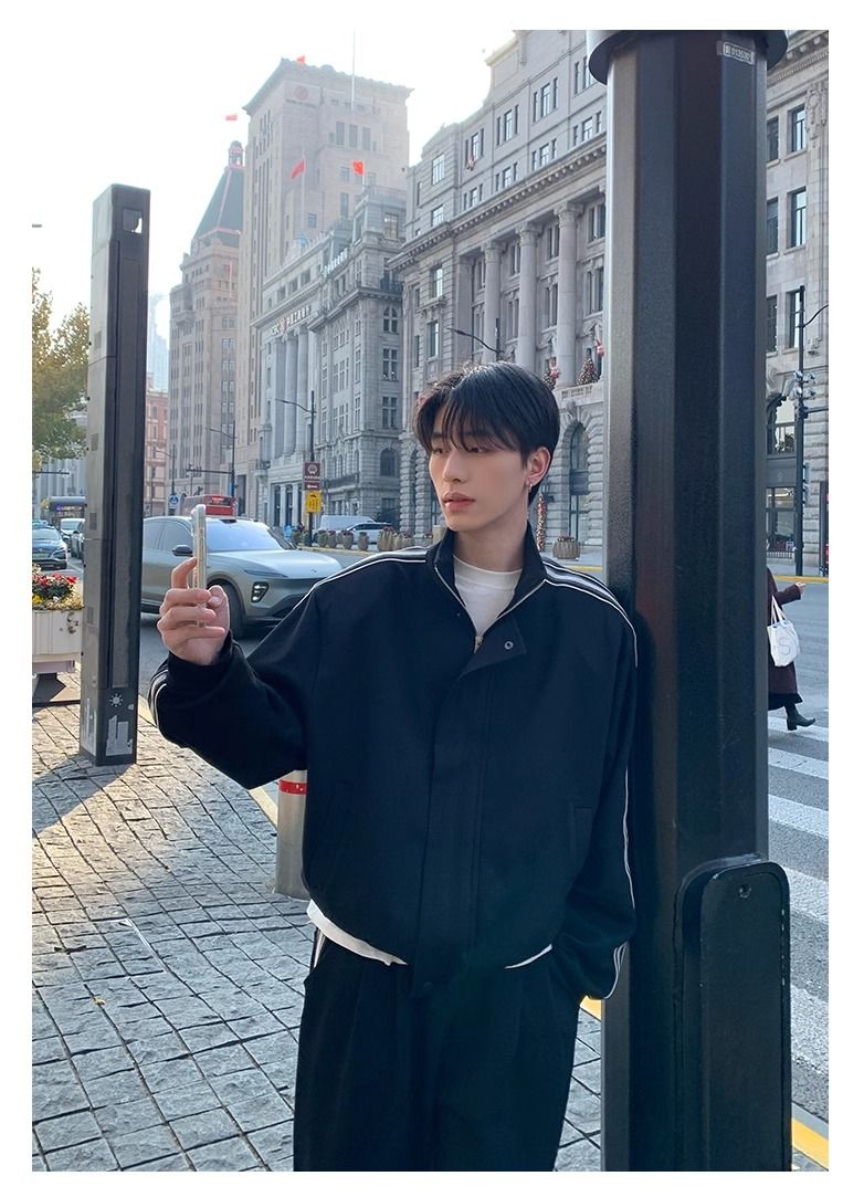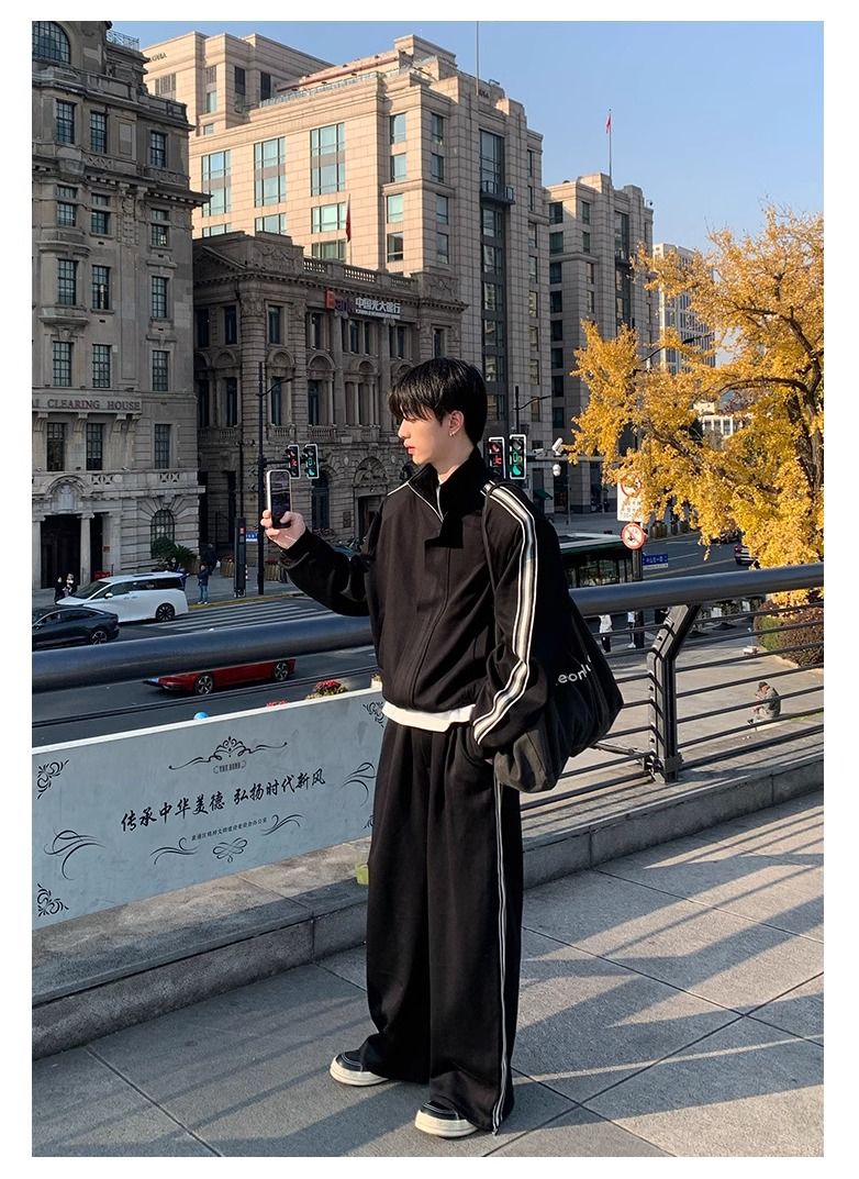 【單件】韓系立領撞色杠條休閒運動兩件套裝