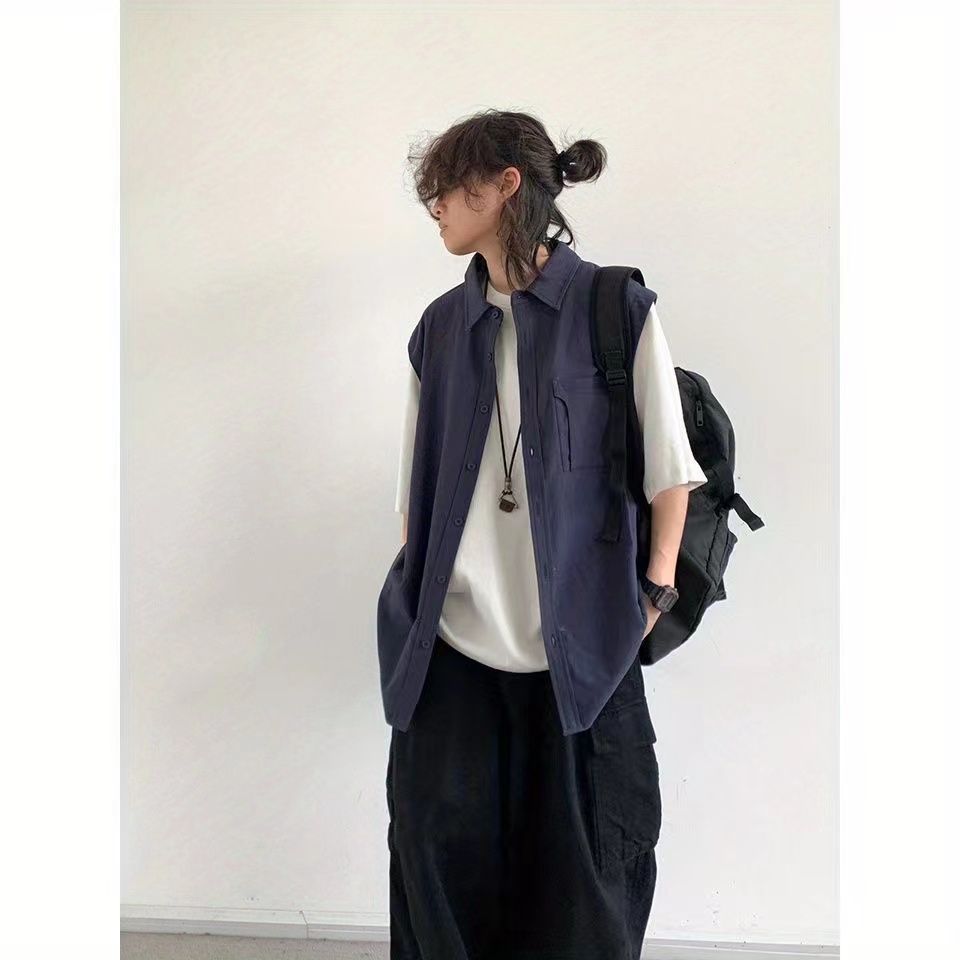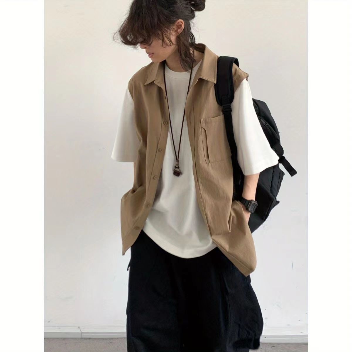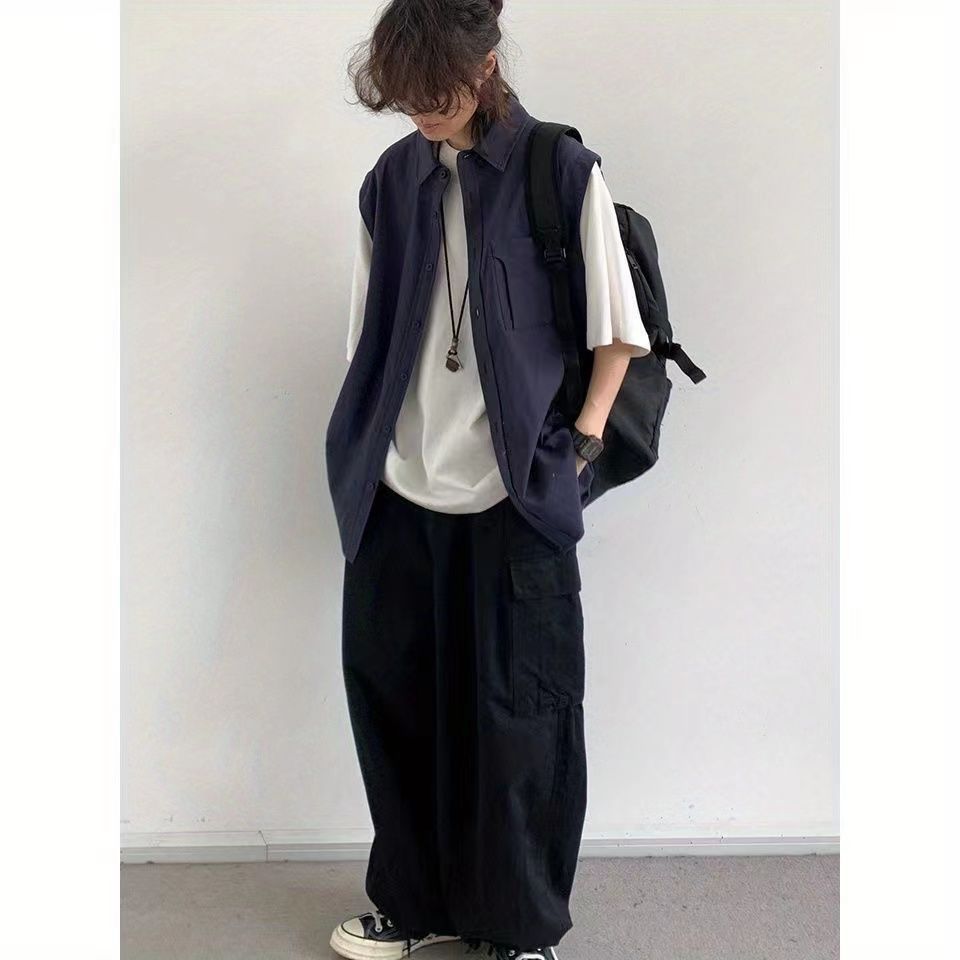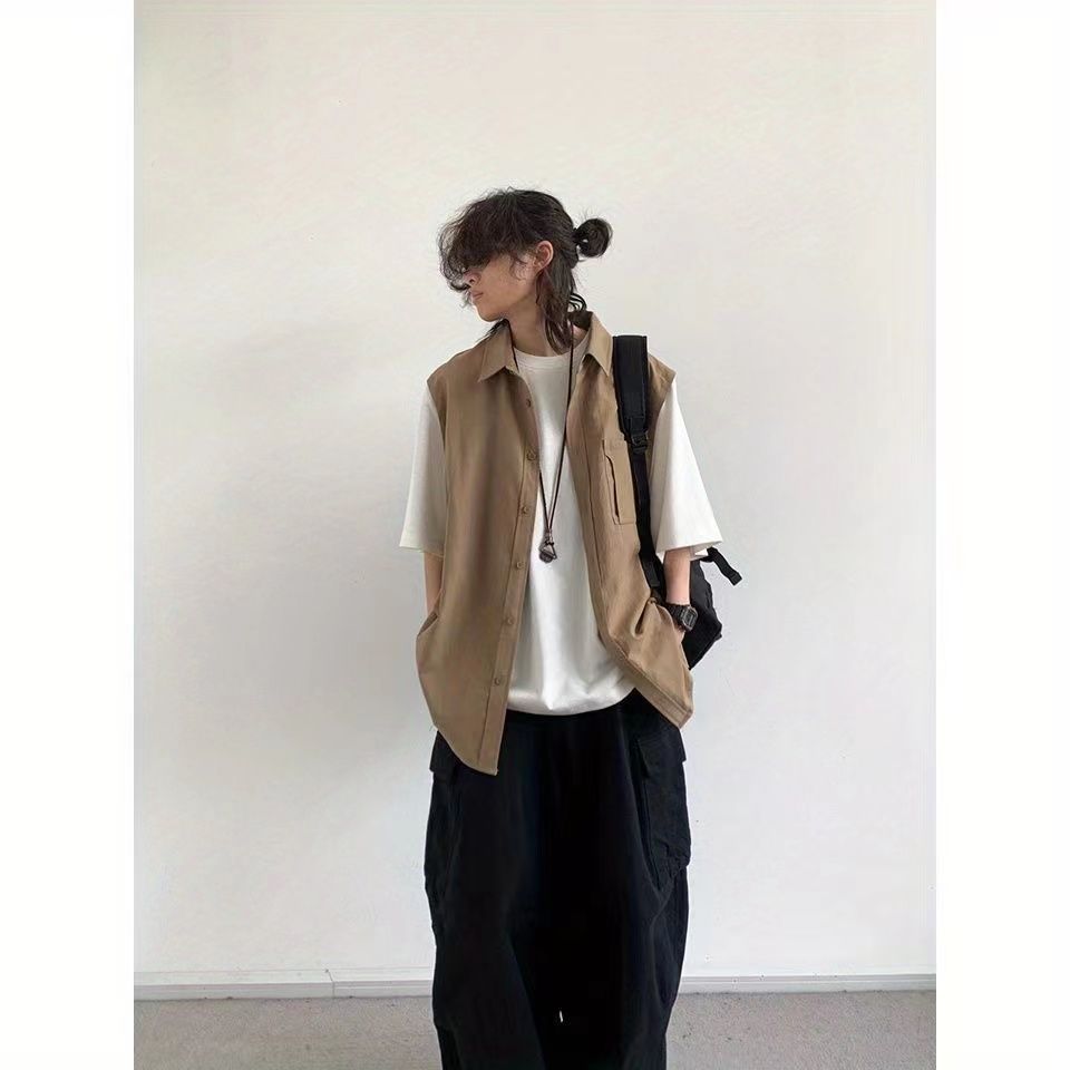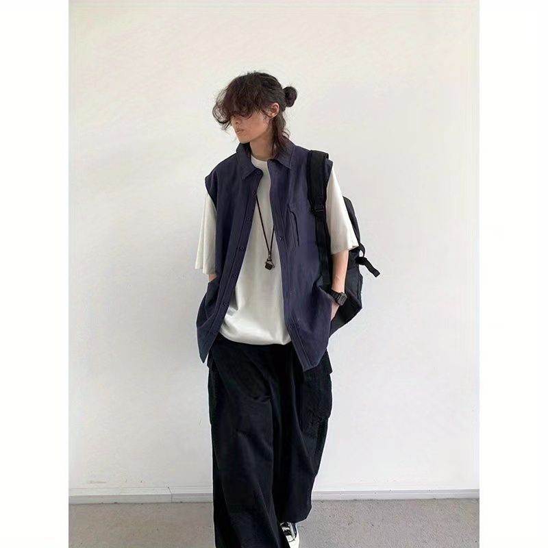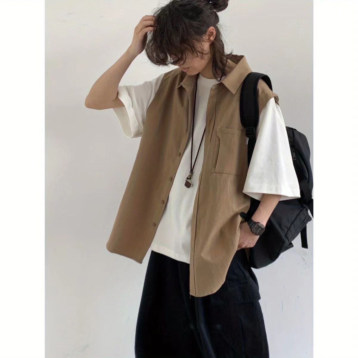 【單件/套裝】日系假兩件襯衫+短袖+項鏈+休閑褲四件套