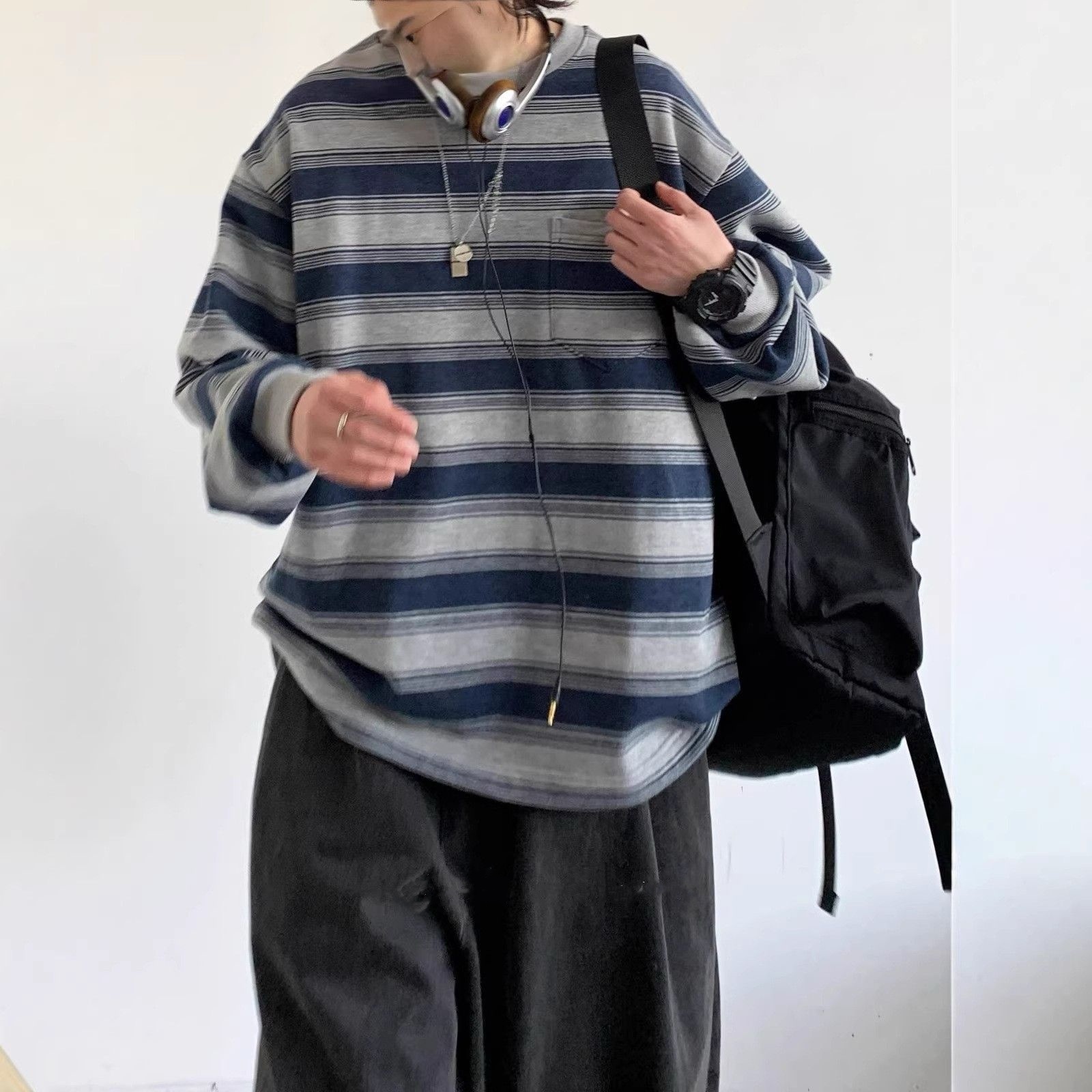 【單件/套裝】日系圓領條紋T恤+休閒褲兩件套裝