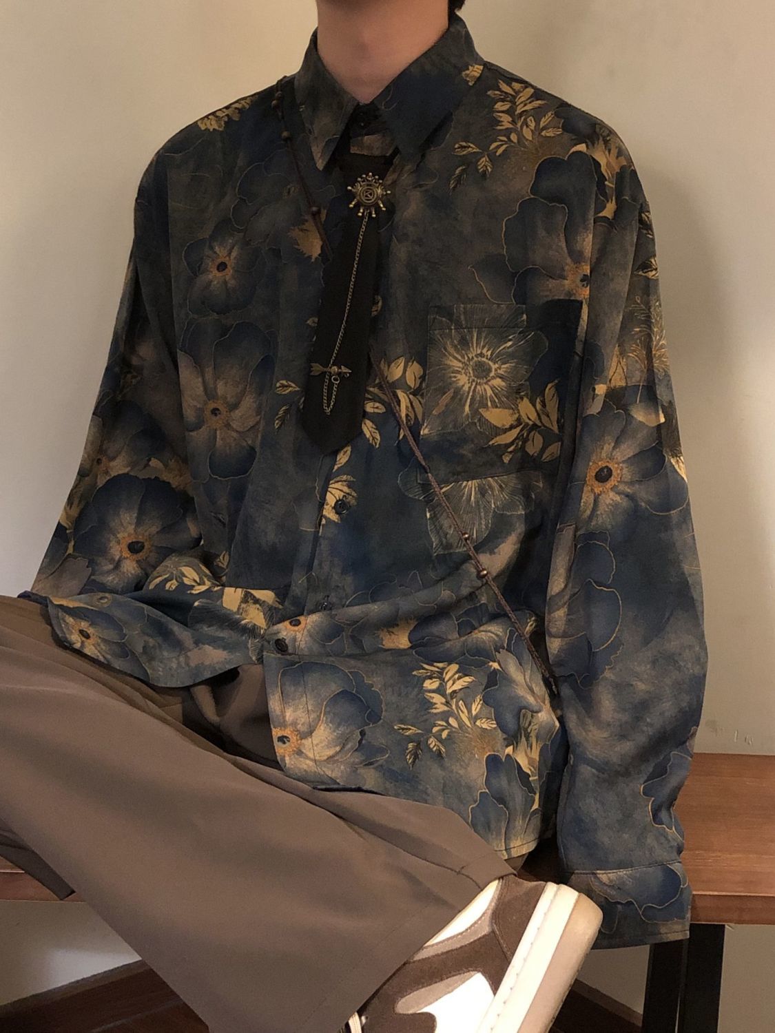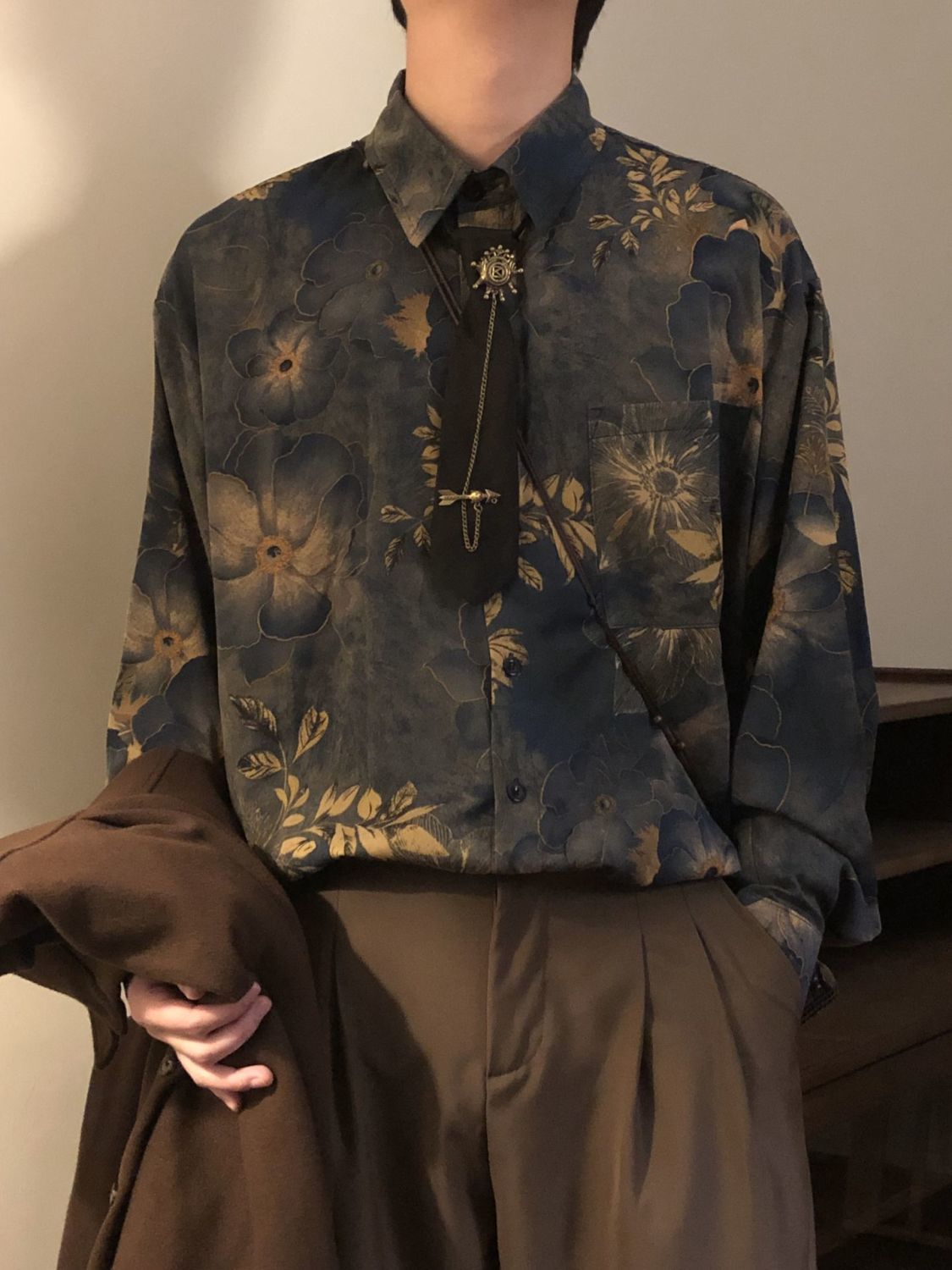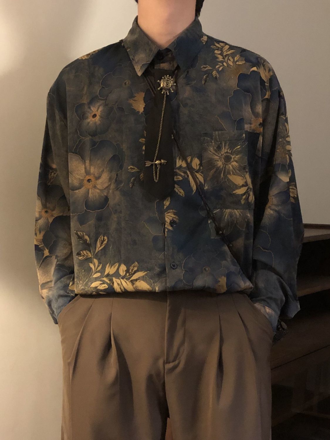 【單件/套裝】新中式古著感印花寬鬆長袖襯衫+領帶+西褲三件套