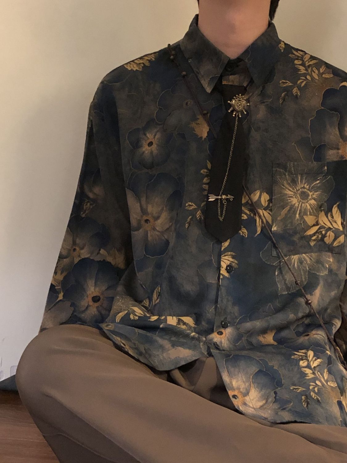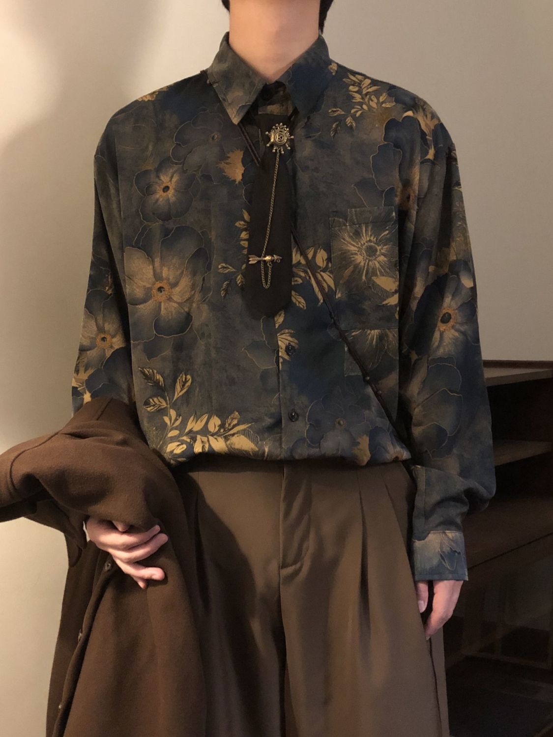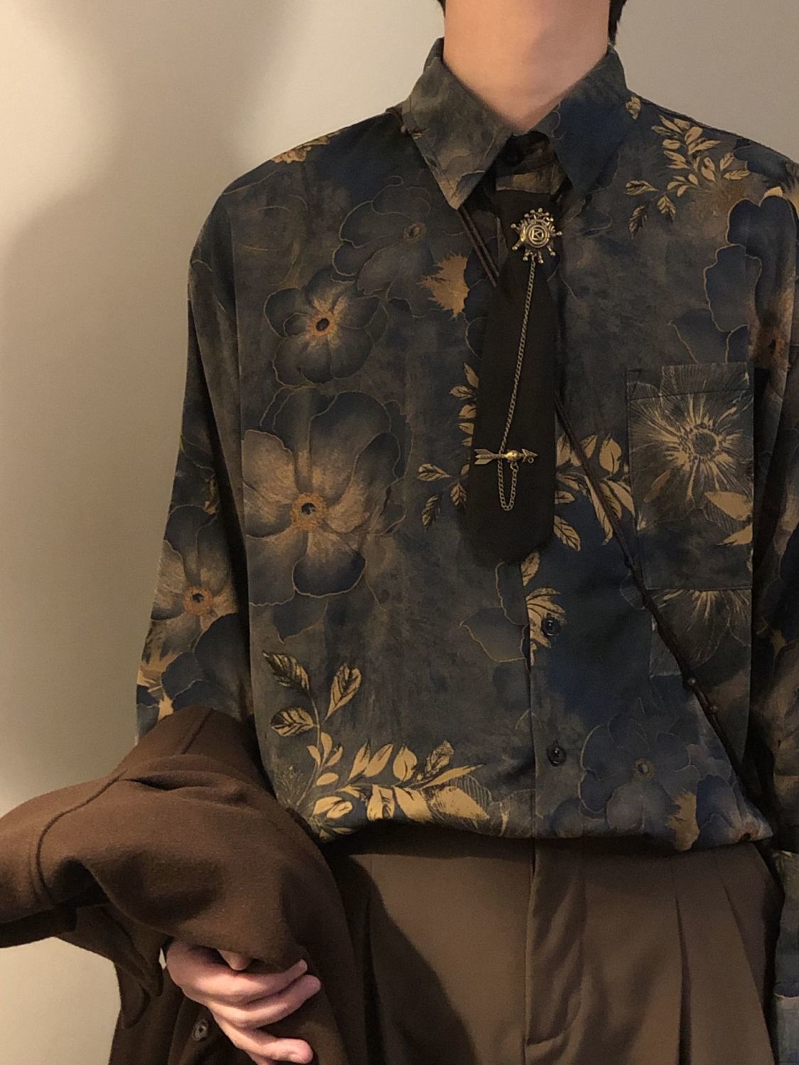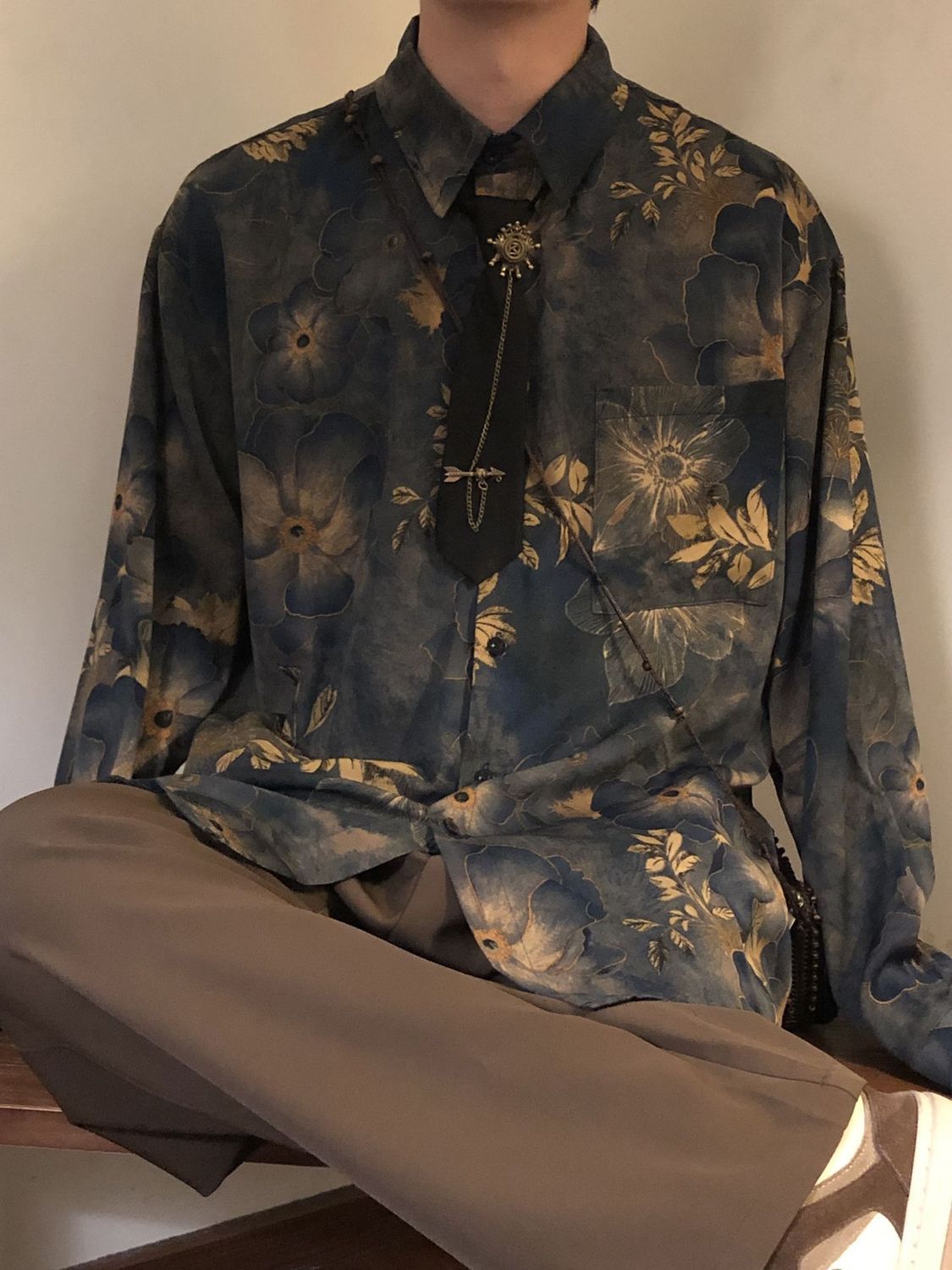 【單件/套裝】新中式古著感印花寬鬆長袖襯衫+領帶+西褲三件套