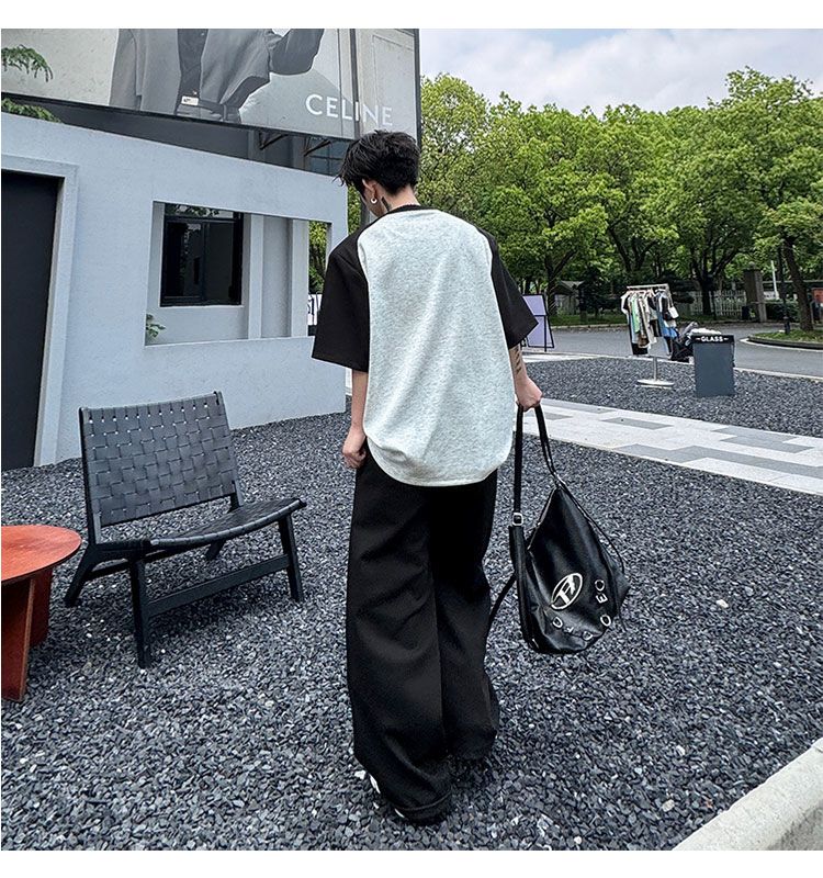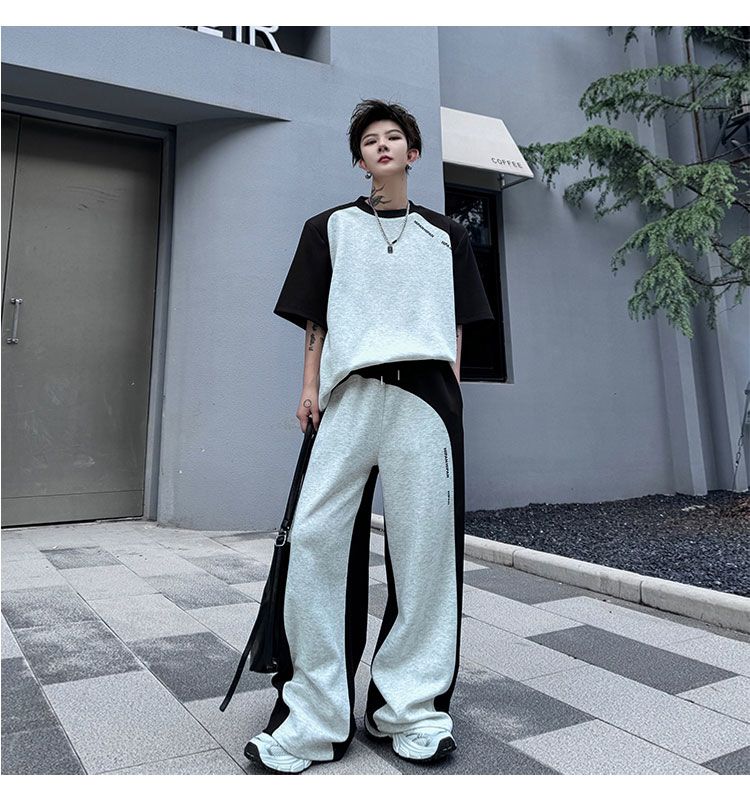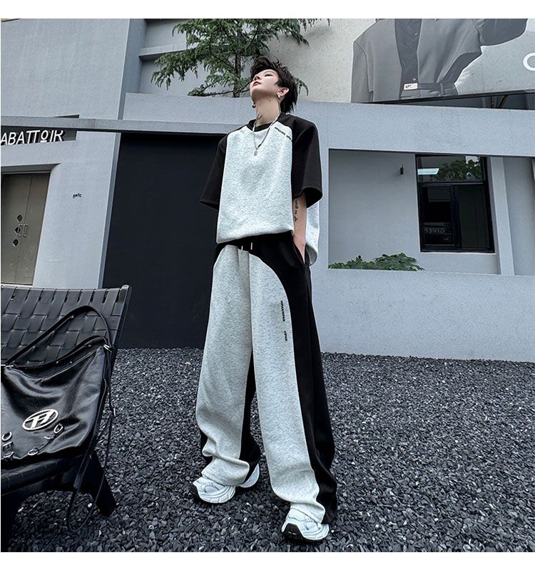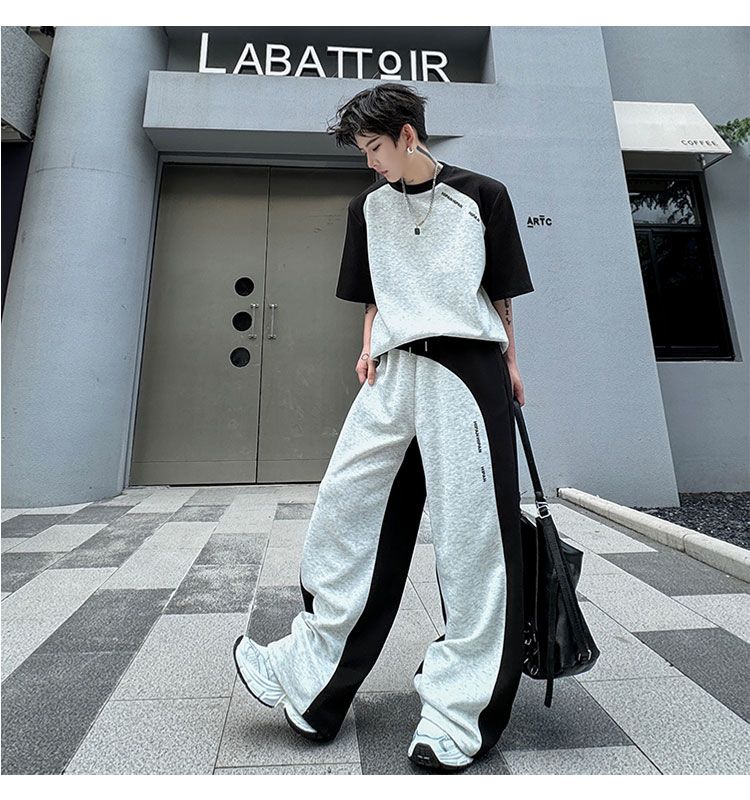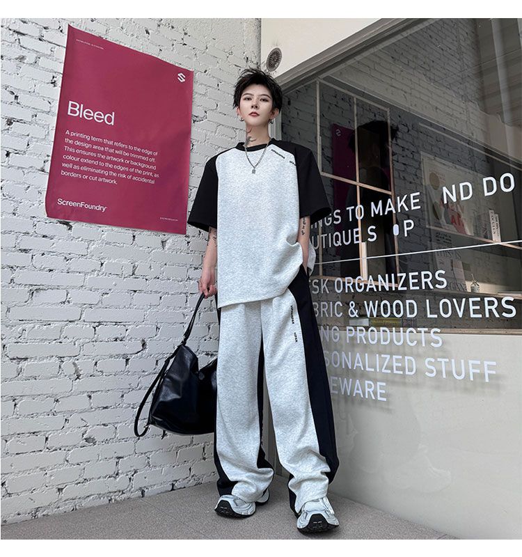 【整套】拼接撞色短袖T恤+設計感休閑長褲兩件套