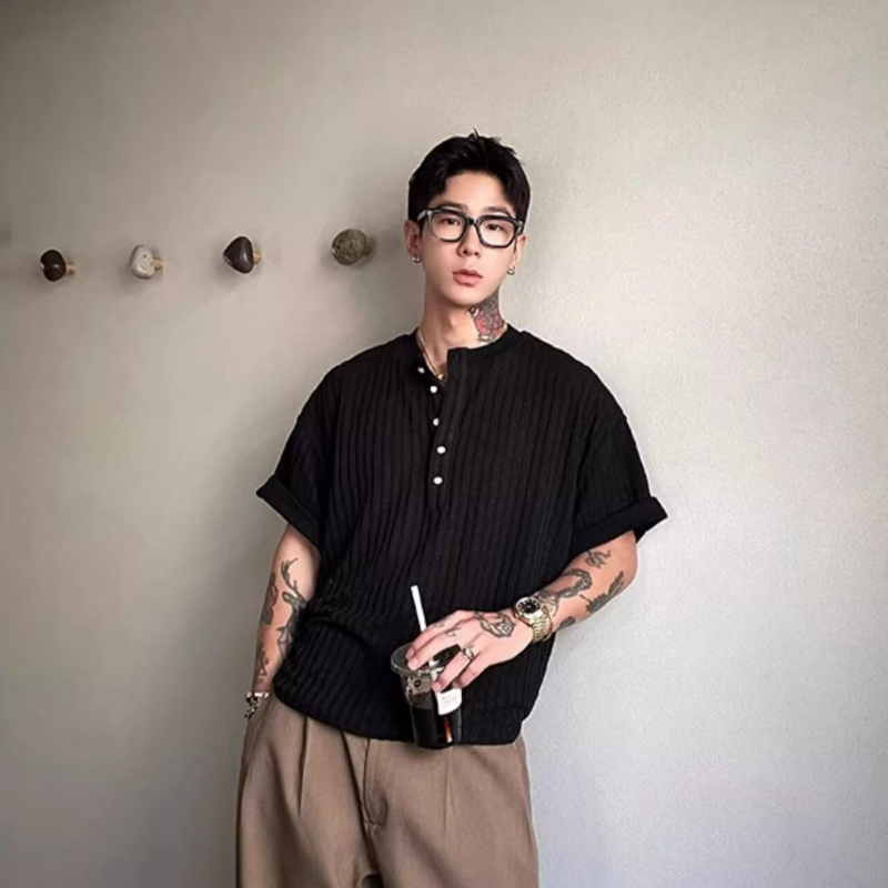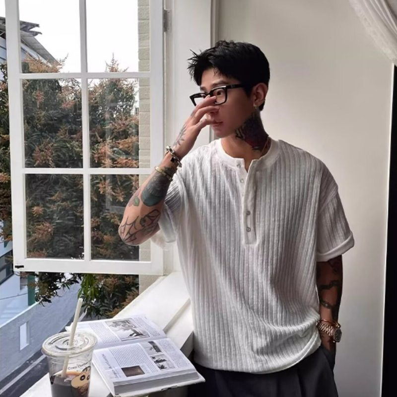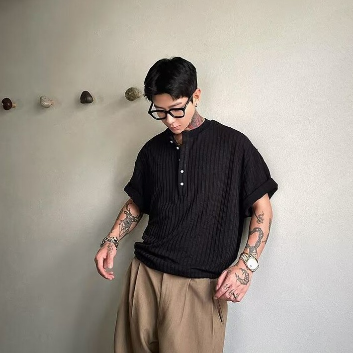 肌理褶皺軟糯感亨利領修身V領短袖t恤
