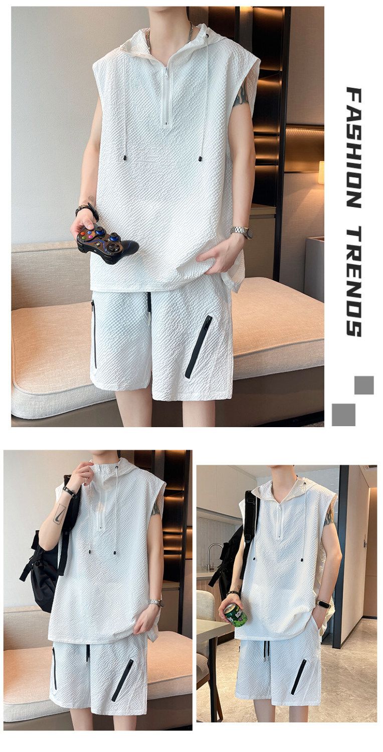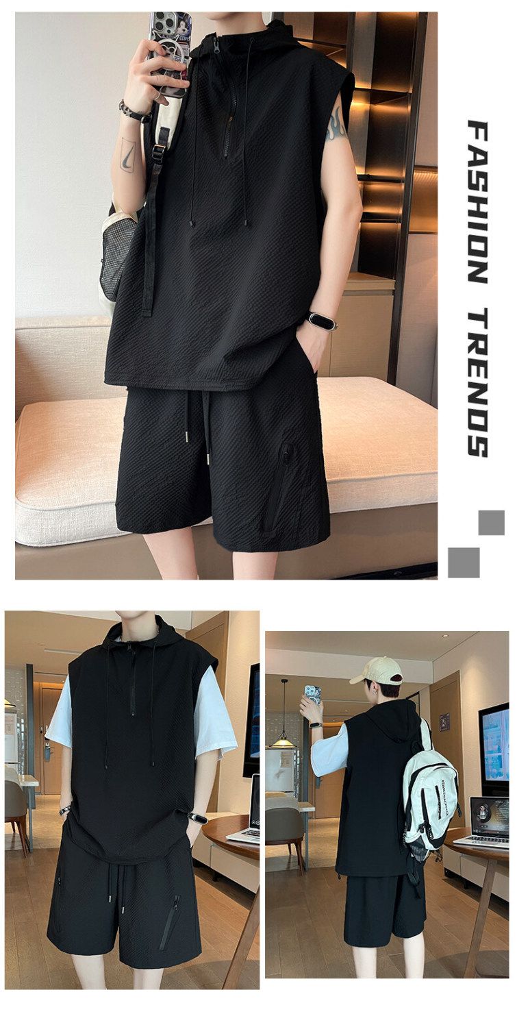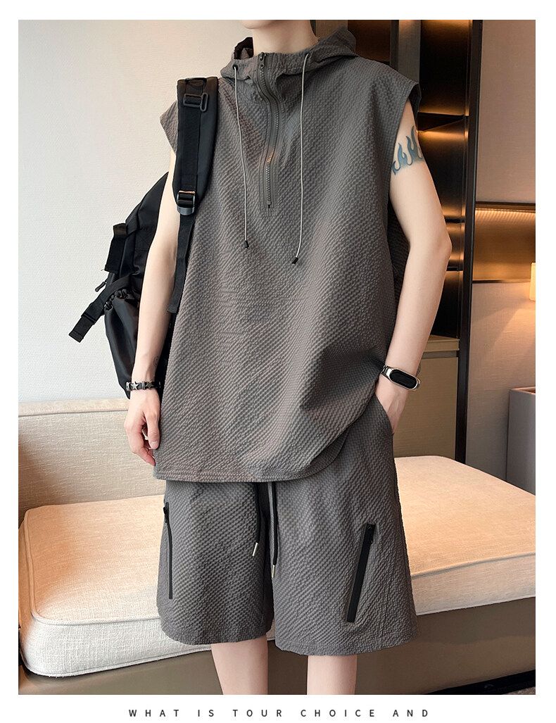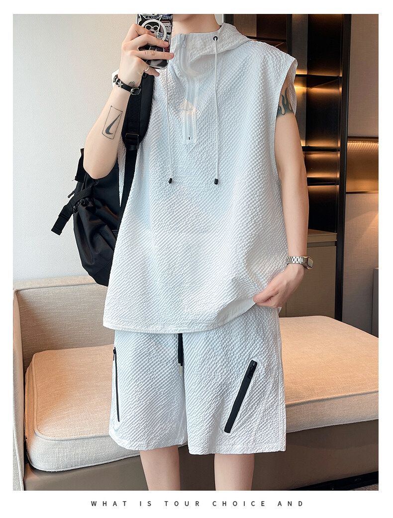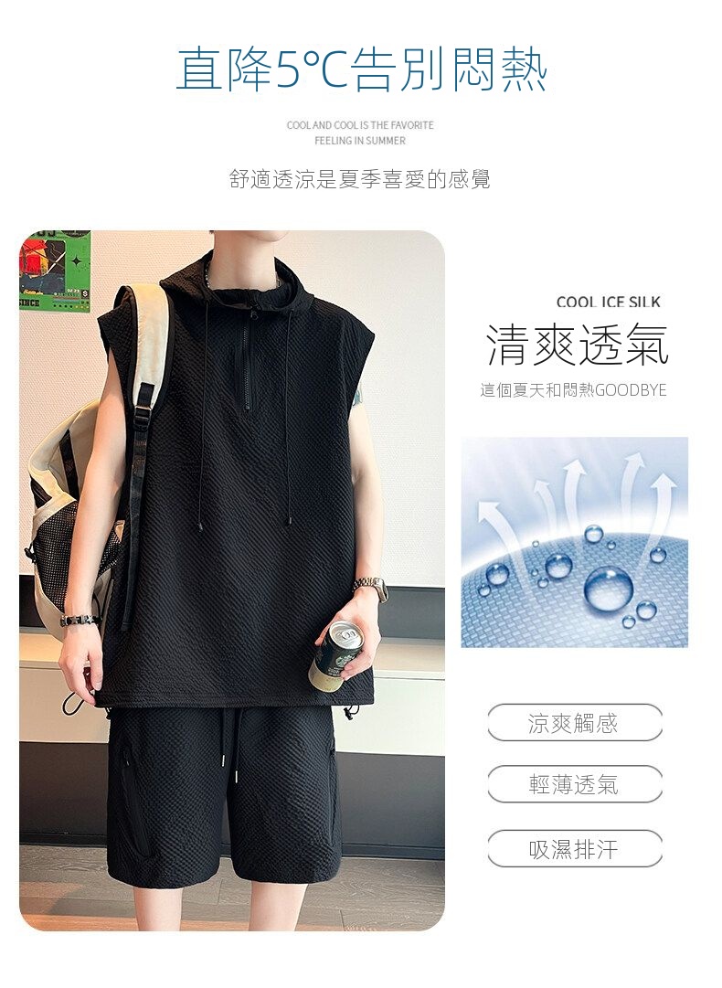 【整套】冰絲休閒運動連帽時尚無袖t恤短褲兩件套裝