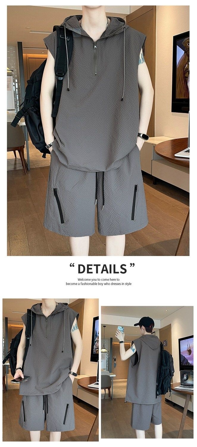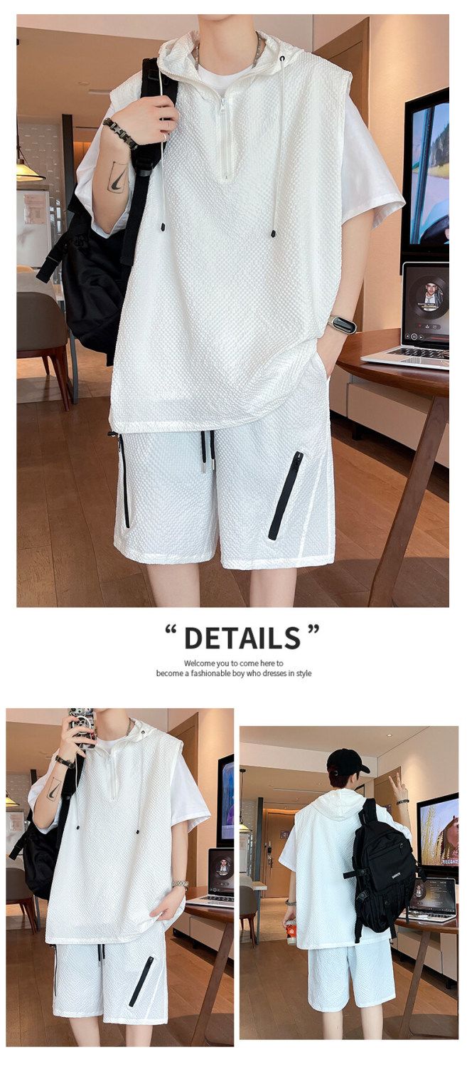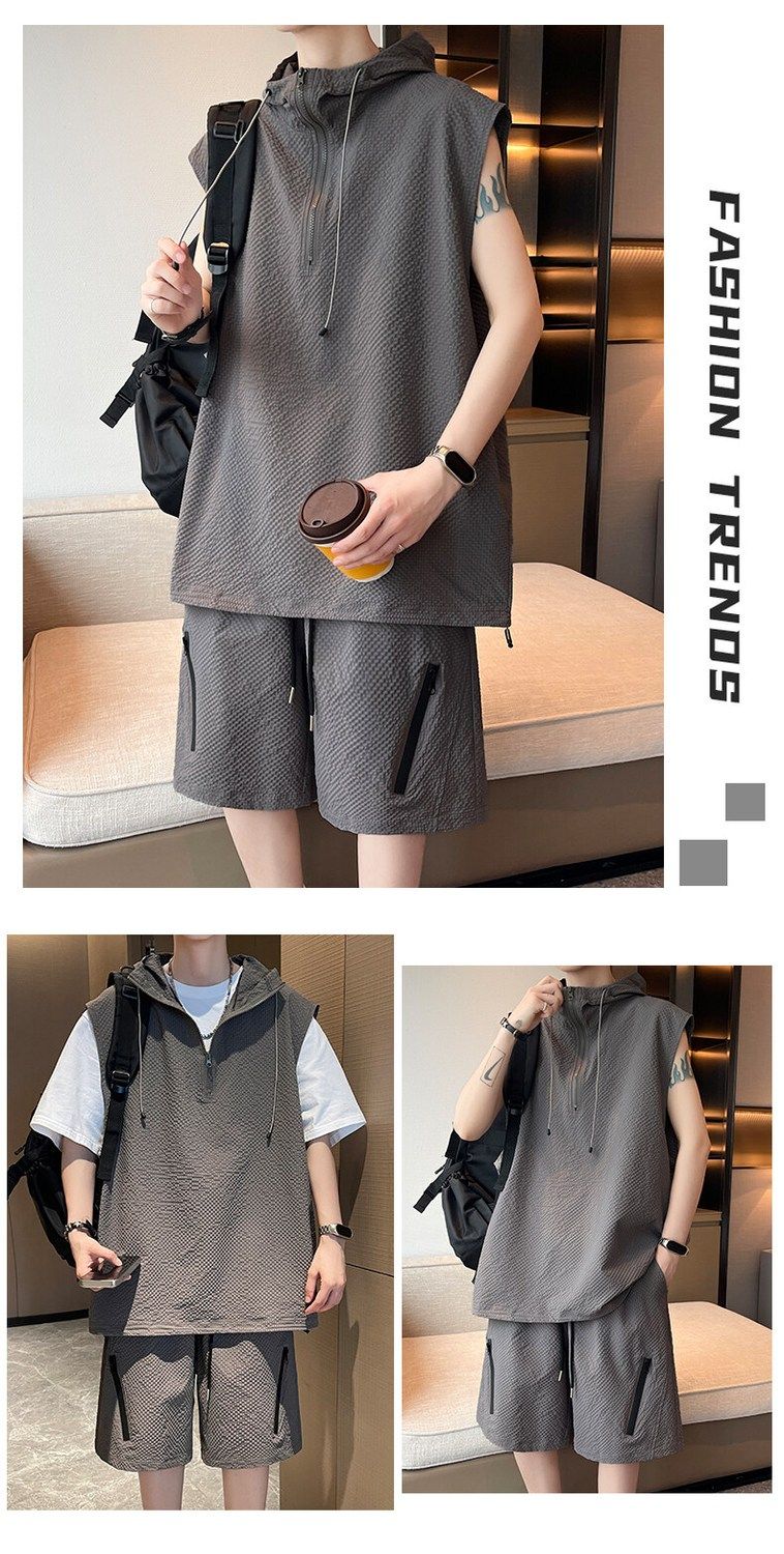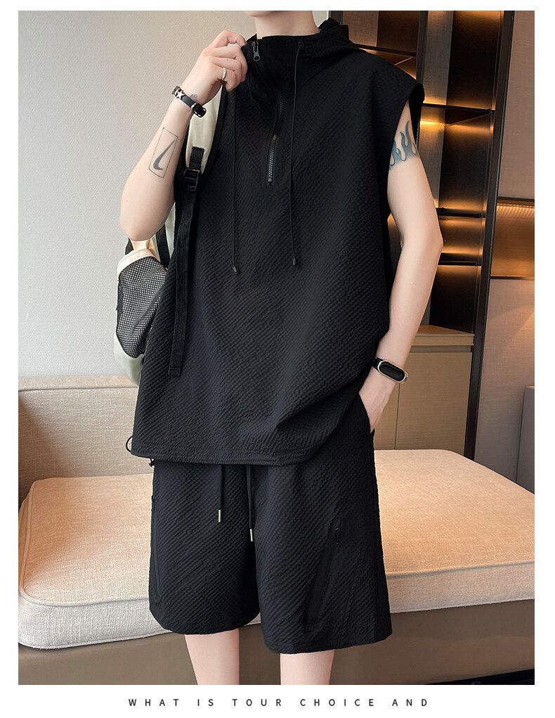 【整套】冰絲休閒運動連帽時尚無袖t恤短褲兩件套裝